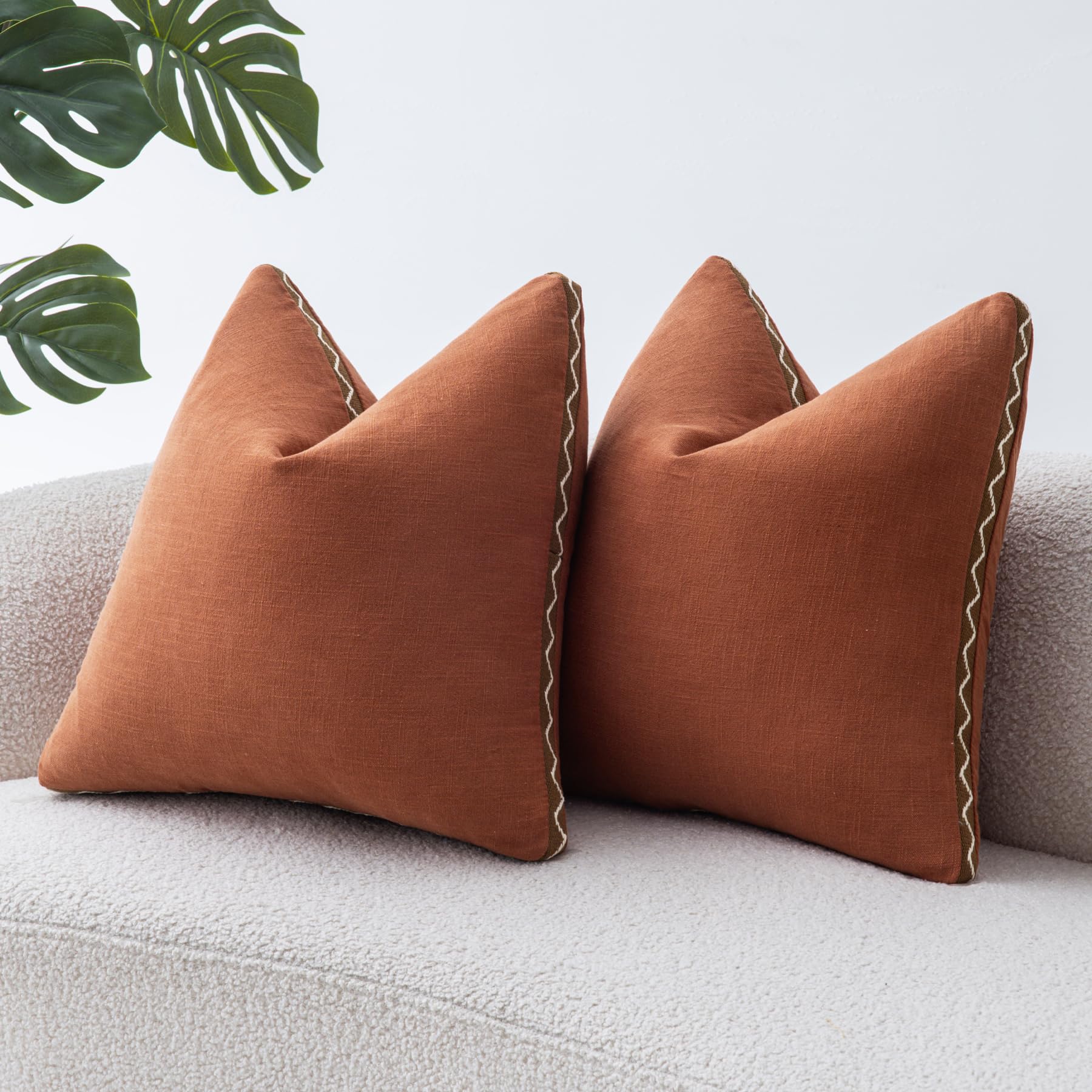 55%cotton 45%linen 【Decorative Woven Trim Detail】 Each 18x18 burnt orange square throw pillow cover is accented with a brown wavy woven ribbon along the edges—an eye-catching detail that elevates the look of your home décor. Perfect for adding depth and warmth to your couch, bed, or bench. *N