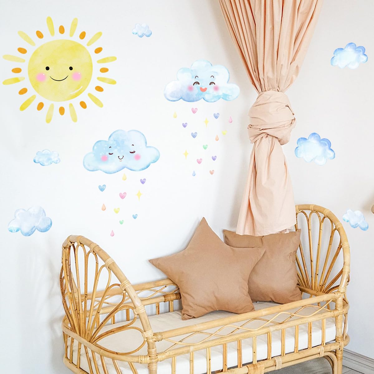SUN WALL DECAL AND WHITE CLOUD WALL DECAL COMBO: Elevate your space with our captivating Sun Wall Decal and Watercolor White Clouds Wall Decal set. Designed for boys' and girls' rooms, children's bedrooms, and nursery decorations, these delightful decals instantly illuminate any room with their whim