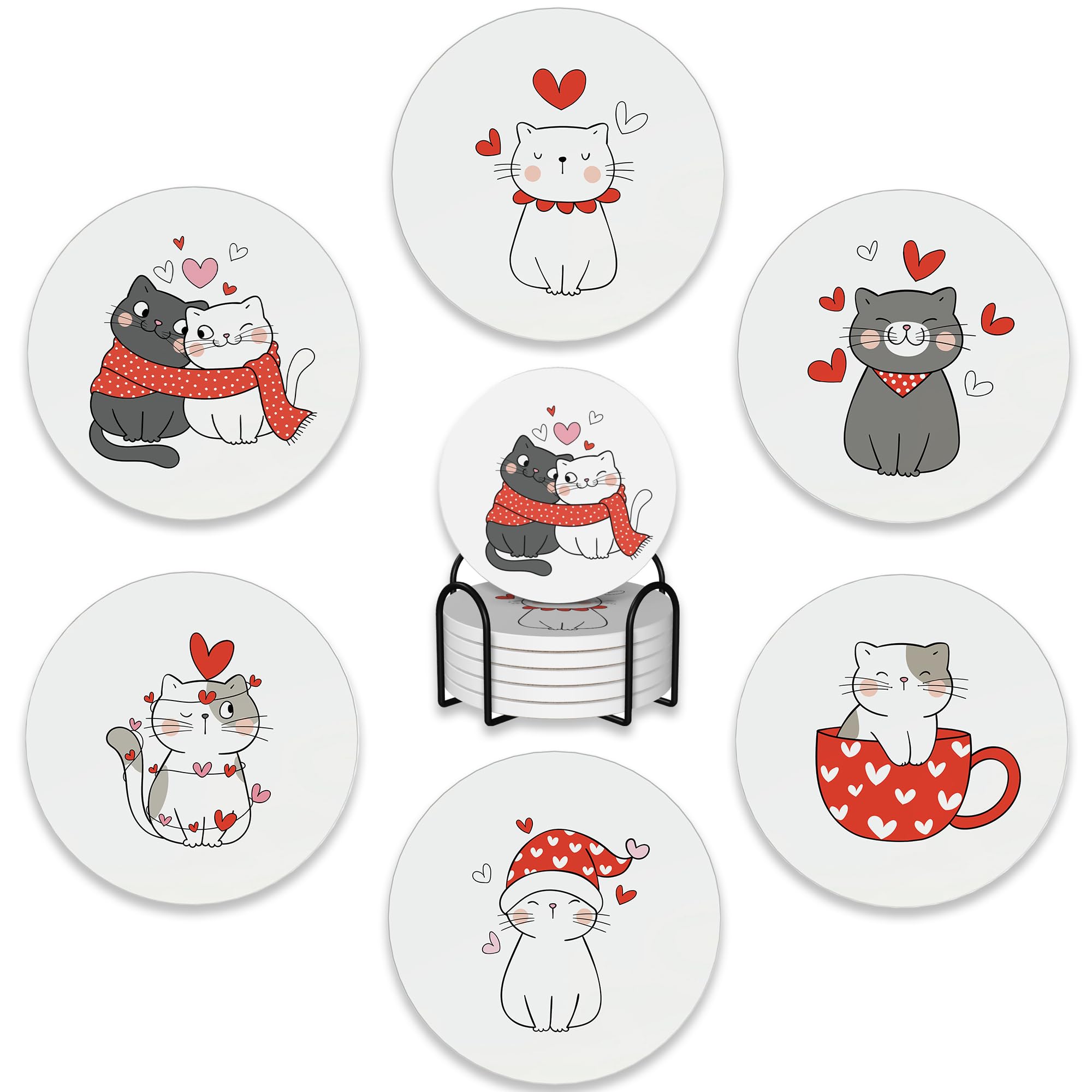6 Pcs Coasters for Drinks with Holder,Sweet Cat in Love Cute Absorbent Coaster with Cork Backing,Great Gift for Housewarming,Room Decor,Bar,Holiday
