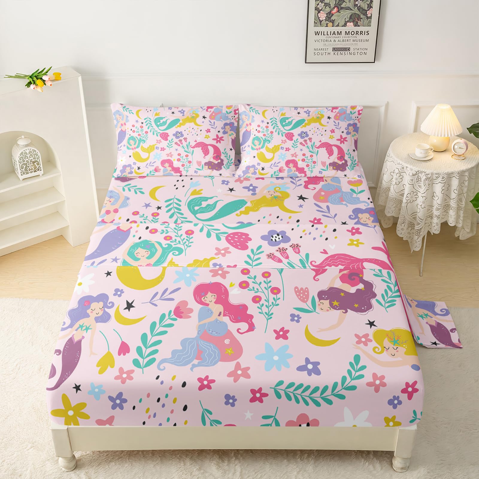 QOOMO Cartoon Mermaid Kids Sheet Set, Pink Floral Kawaii Bedding Set with Full Size for Girls,Super Soft Breathable Bedding Set Room Decoration, 1