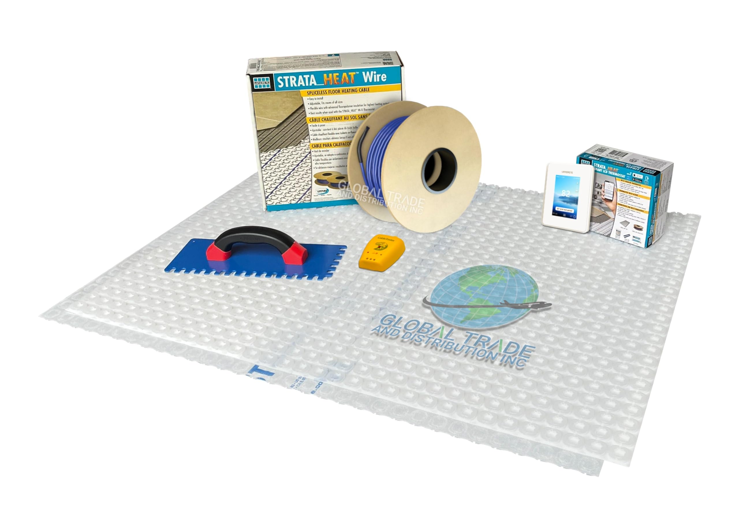 This electric radiant floor heating kit includes the heat cable (0804-0415-4), Smart LCD WiFi thermostat (0804-0404-TW), and all essential components, which are specifically designed for use with and compatible with Strata Heat membrane (161 Sq Ft) by Laticrete (Included) Wi-Fi Compatible Smart Ther