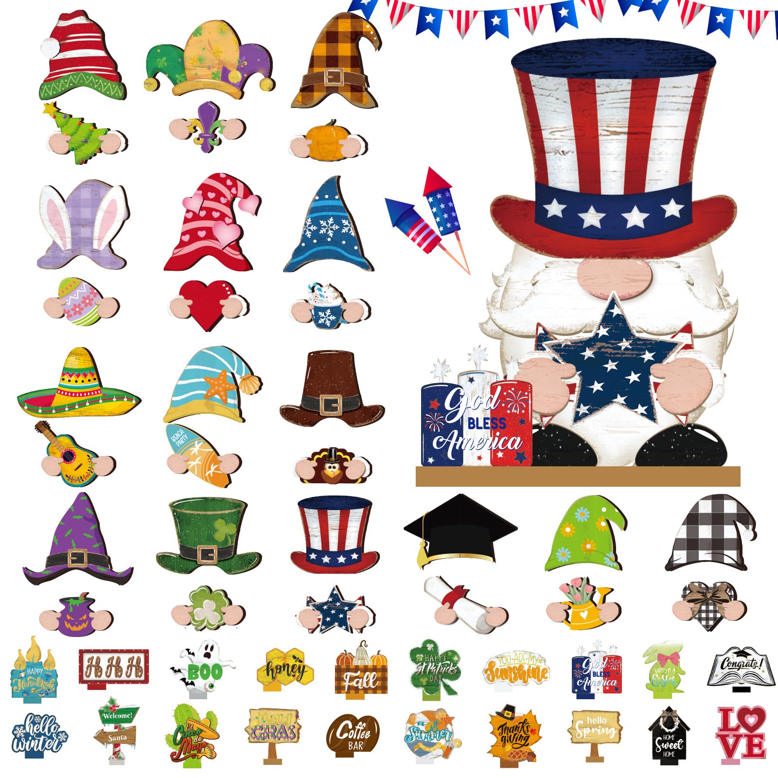Yalikop 62 Pcs Interchangeable Wooden Gnome Decor Spring Gnome Decor with Magnet Pieces and Detachable Hats 4th of July Graduation Wooden Home Table
