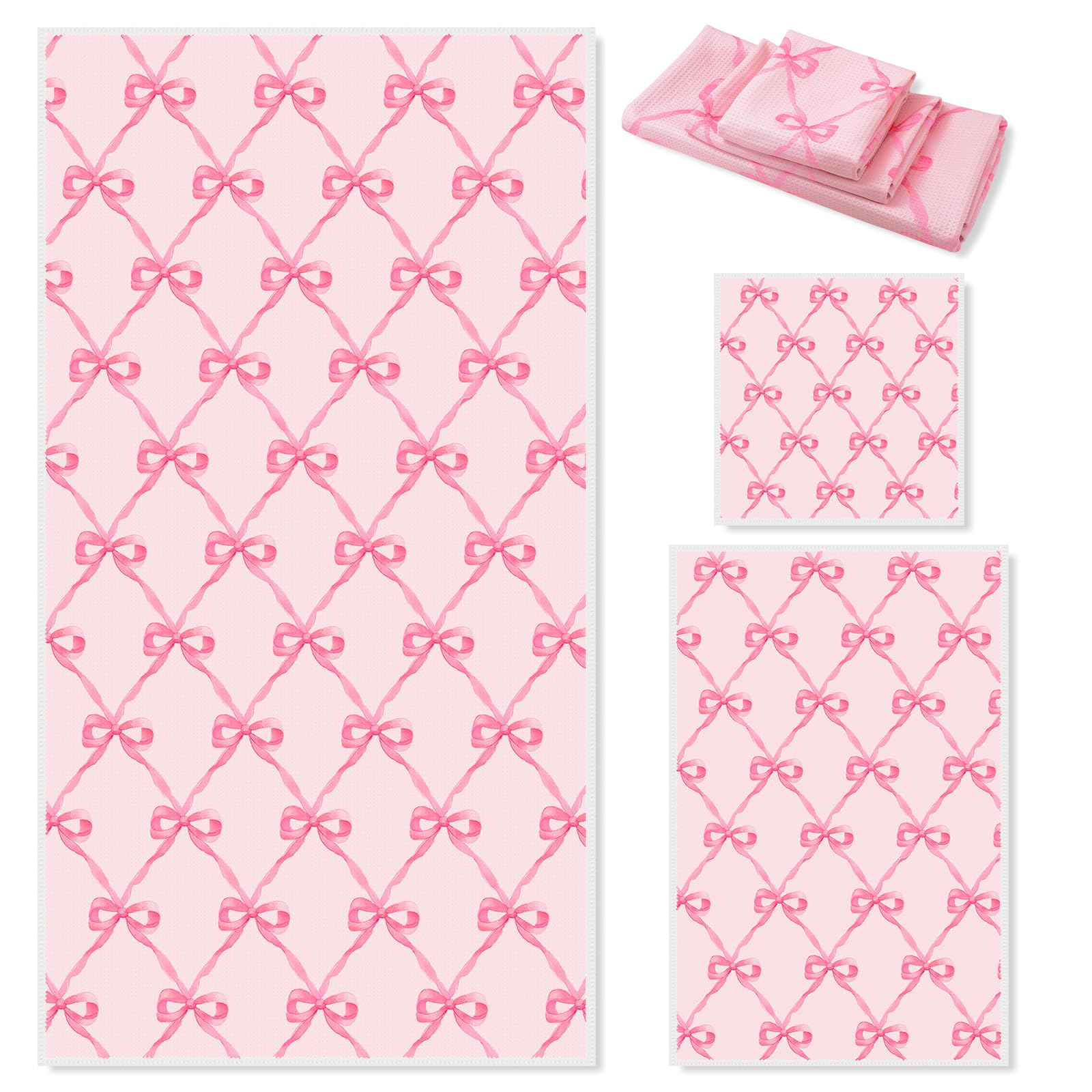 PACKAGE CONTENT: 1 pc bath towel, 1 pc hand towel and 1 pc wash towel are contained in the set, great for cleaning and drying ELEGANT DESIGN: Our towel set is colored in pink and printed with pink bow tie patterns, delicate and stylish, concise design can well add an elegant touch to your home PROPE