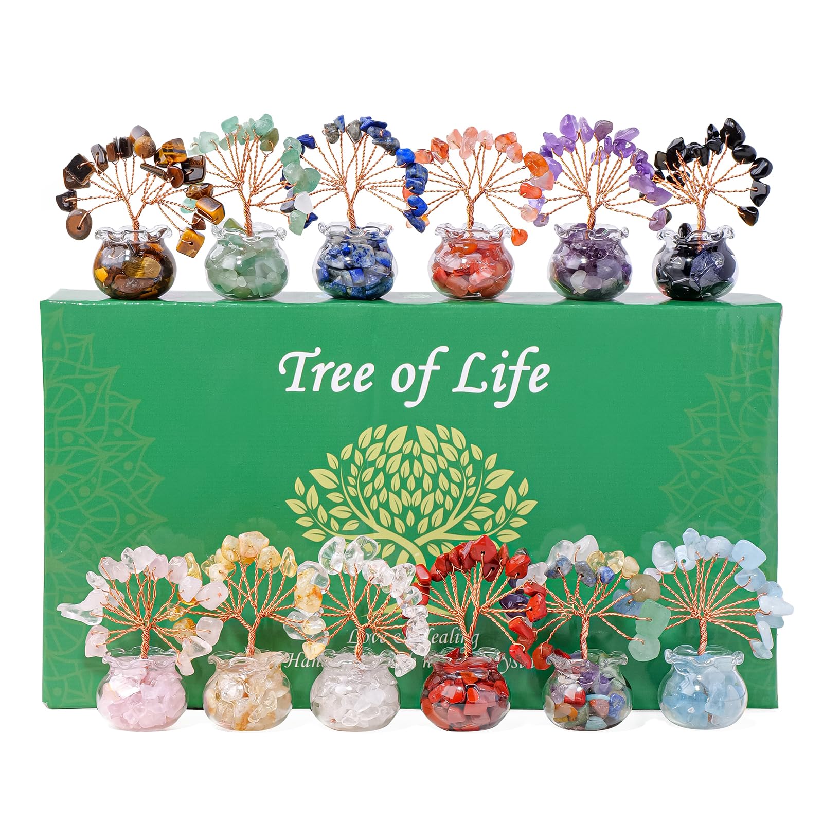 What you get: Each set includes 12pcs crystal trees with glass base.About 18 crystal beads in each mini crystal tree.Glass base includes same crystal stones Size: Crystal tree height about 2.1-2.4 in,glass base width about 0.9 in,12pcs crystal trees set weighs about 0.76 lb Collection of 12 pcs Chak