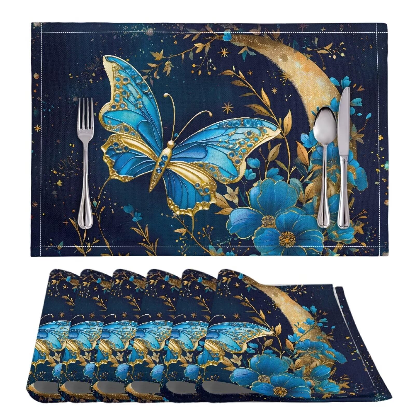 ZFRXIGN Blue Butterfly Placemats Set of 6 Pack Heat-Resistant Placemat for Dining Table, Holiday Decor Table Mats 11 x 17 Inch Flower Moon Night