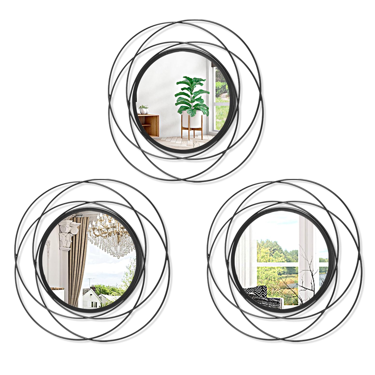 MIRROR SIZE: 3 Set . Measuring at about 12" Diameter with metal frame . These metal artpieces work great alone, or as a set with other multiple matching wall decors. This mirror is wonderful for making a beautiful modern vanity in your bathroom or adding some light and dimension to any space in your