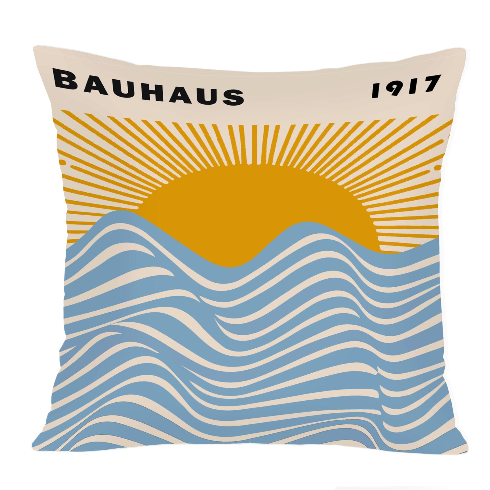 Ethan Taylor Abstract Throw Pillow Soft Cushion Cover 'Bauhaus Waves & Sun in Blue and Orange Patterns Waves' Bohemian Pattern Decorative Square