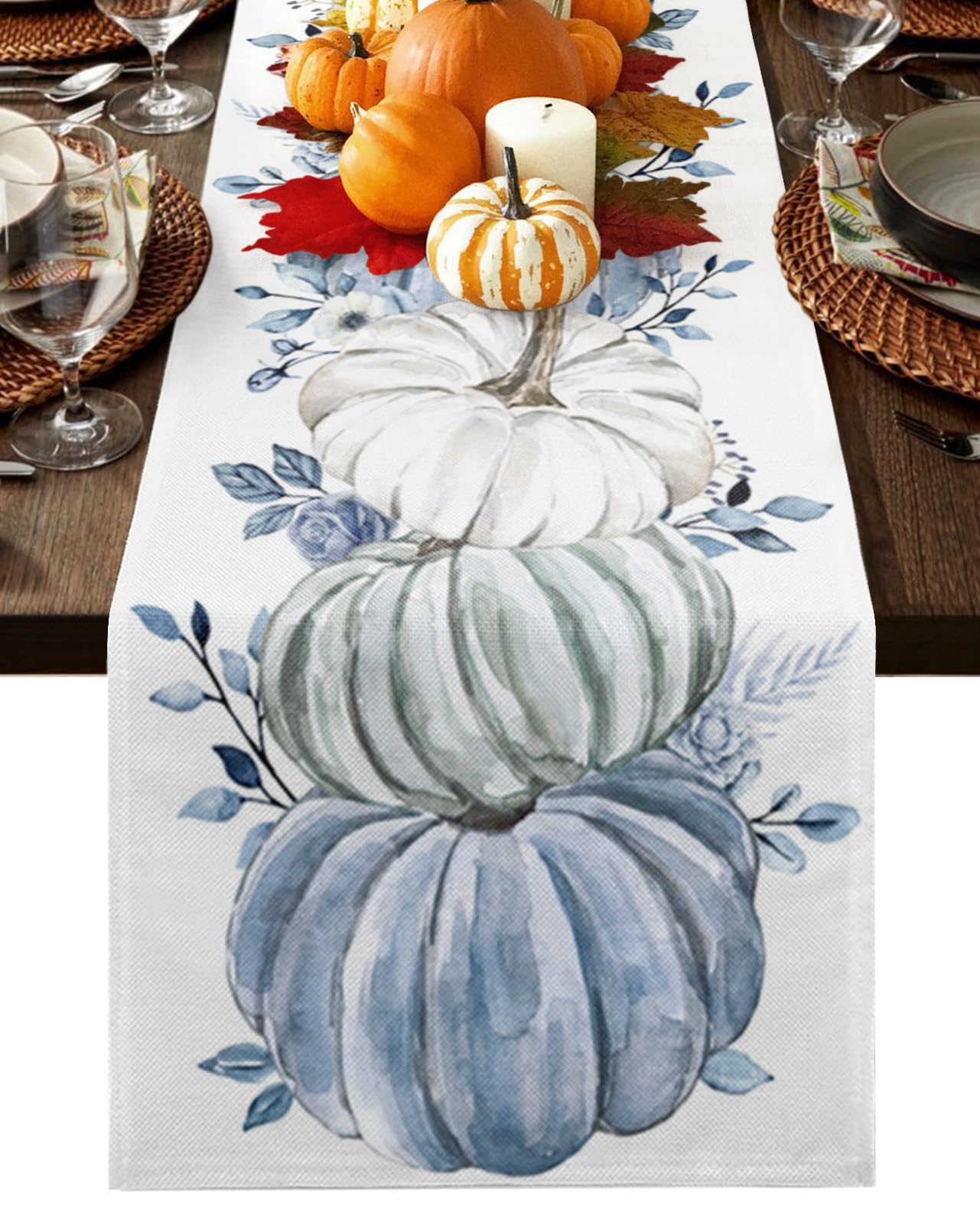Fall Table Runner White Blue Pumpkin Table Runners Harvest Thanksgiving Blue Eucalyptus Leaves Cotton Linen Dresser Scarf Kitchen Dining Table Decor