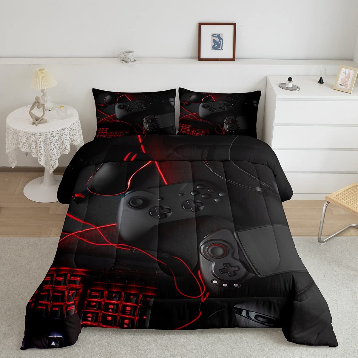 Feelyou Gamer Comforter Set for Boys Teens Kids Game Headphones Keyboard Mouse Gamepad Duvet Cover Queen Size Black Red Gaming Bedding Set Game
