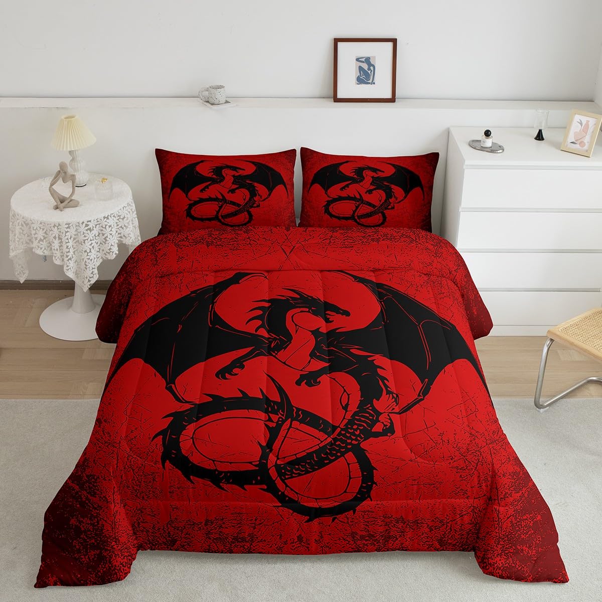 Feelyou Kids Black Dragon Bedding Set Queen Size, Red Black Comforter Set Boys Girls Exotic Chinese Style Comforter Vintage Duvet Insert Kids Room