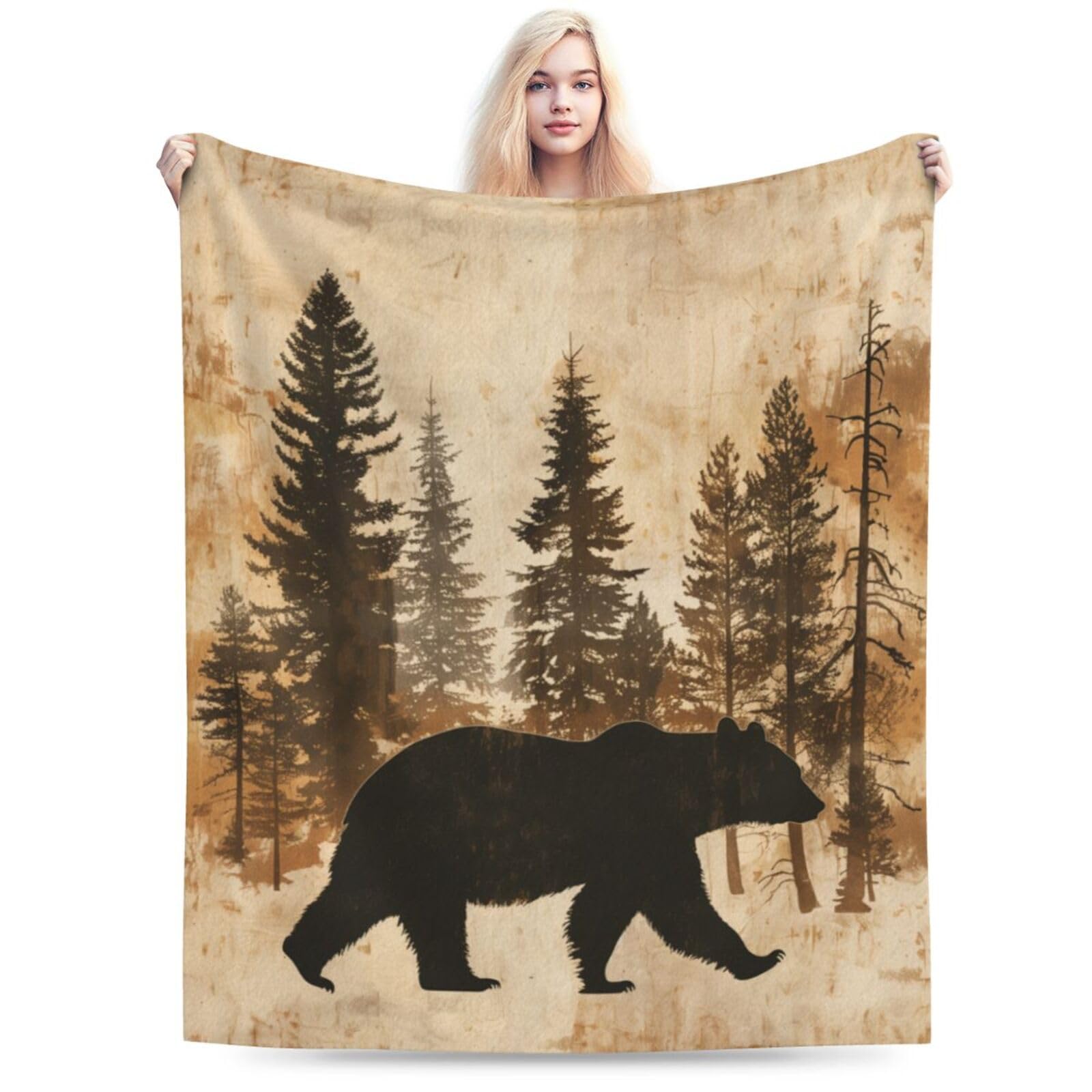 Qycazzw Bear Forest Silhouette Blanket Gifts for Women Kids, Rustic Wildlife Theme Flannel Blankets, Warm Cozy Soft Throw for Bedroom, Camping, Couch,