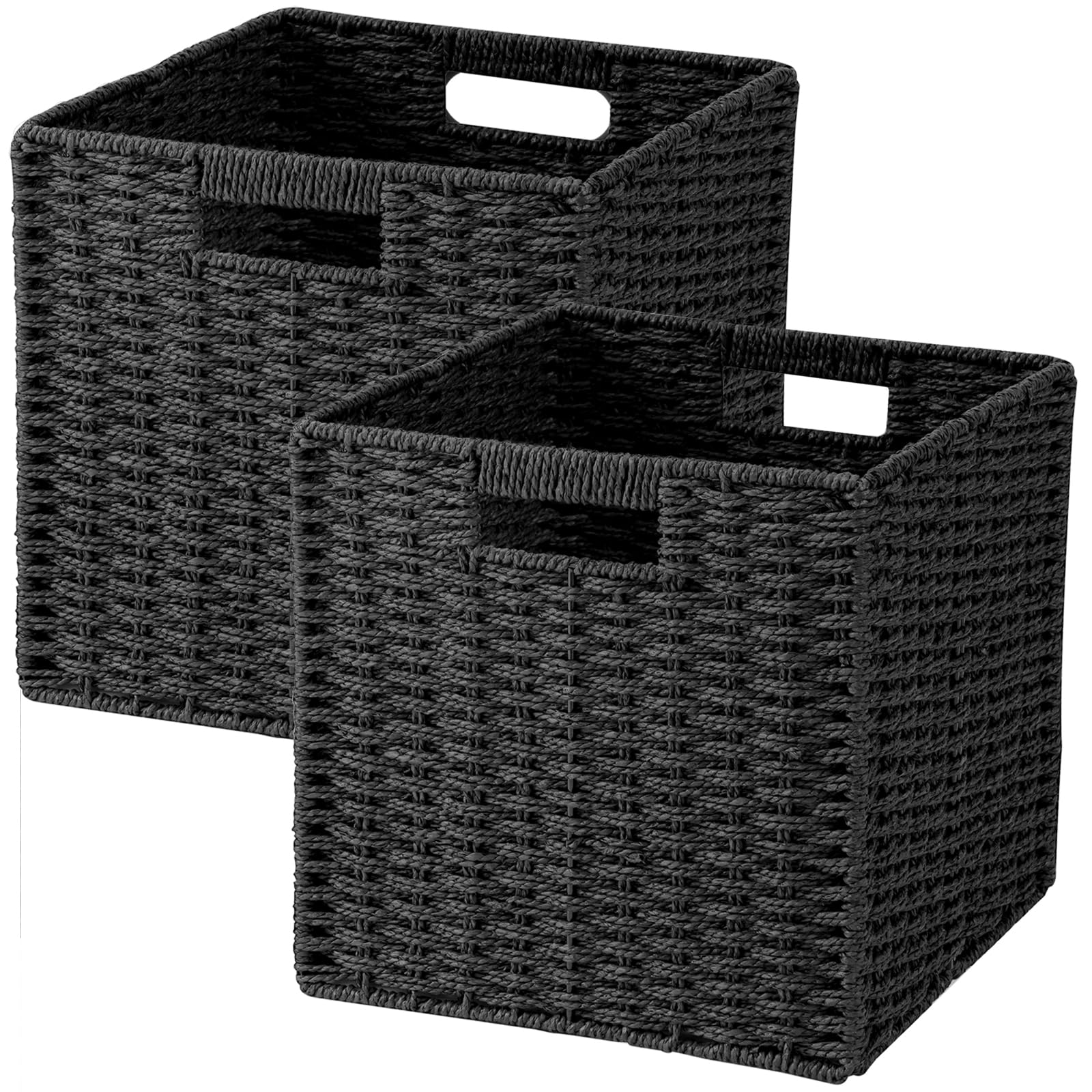 Woven Wicker Storage Baskets 2-Pack, 11x11 Handwoven Paper Rope Organizer Bins, Foldable Cube Storage Cubes with Built-in Handles for Shelves and
