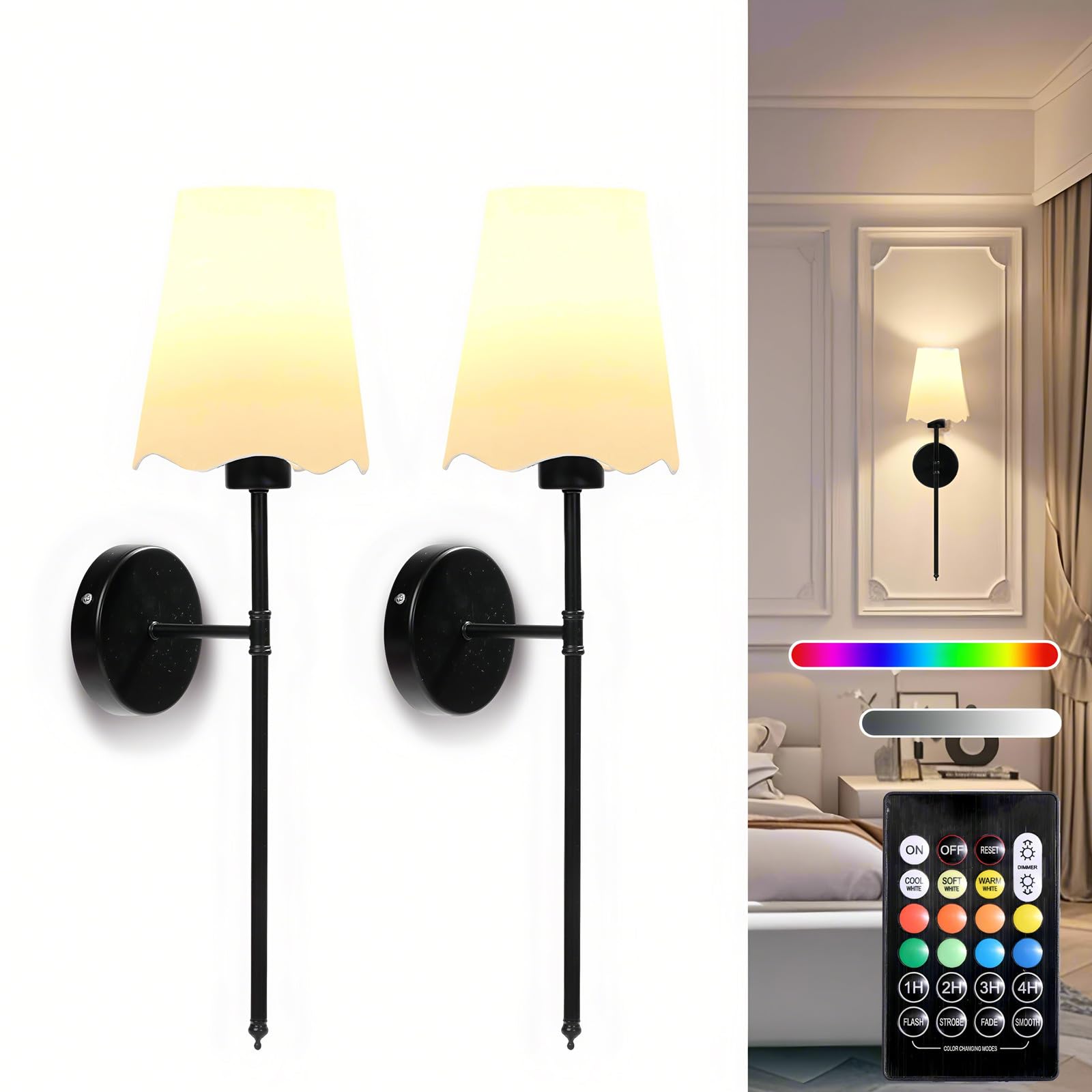 Battery Operated Wall Sconce Set of 2,Black Rechargeable Wall Lights with 5200mAh Dimmable Detachable LED Bulbs and Remote Control,11 Colors Wireless