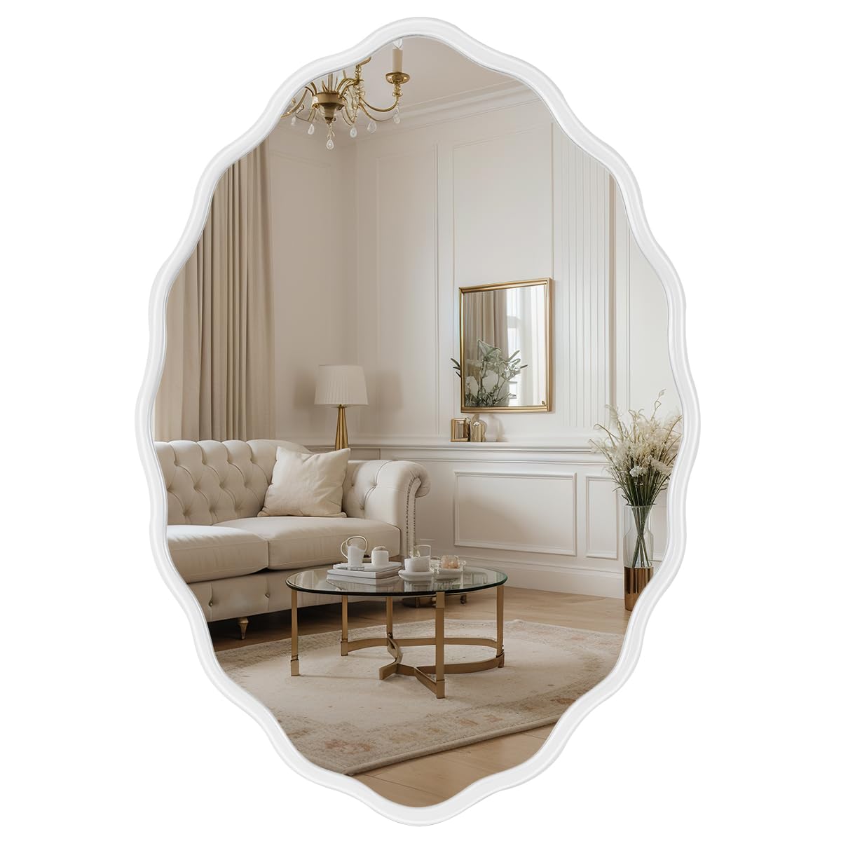 Large & Functional Wall Mirror – Ideal as a large oval bathroom mirror, this piece enhances lighting and space. Perfect for use as a bathroom vanity mirror, nursery mirror, or decorative wall mirror in any room. Ornate Design – Featuring a beautifully scalloped, wavy metal frame with an antique-