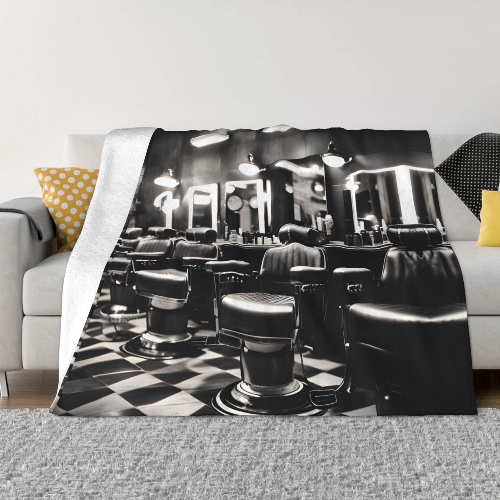 YQxwJL Flannel Fleece Blanket, Barber Shop Monochrome Style Print Soft and Warm Throw Blanket, for Couch, Bed, and Outdoors