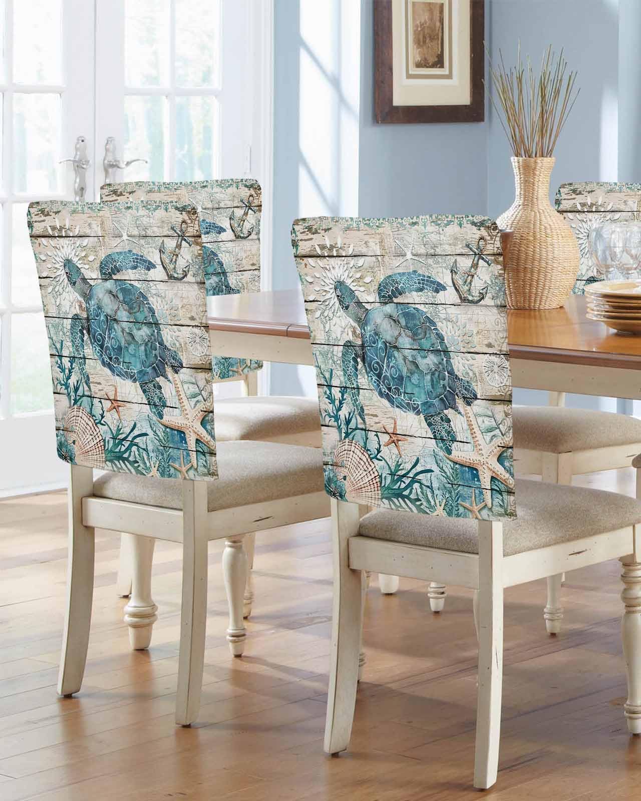 Teal Coastal Turtle Chair Back Covers Set of 4, Dining Back Chair Cover Removable Washable Back Slipcovers, Ocean Coral Nautical Anchor Retro Kitchen