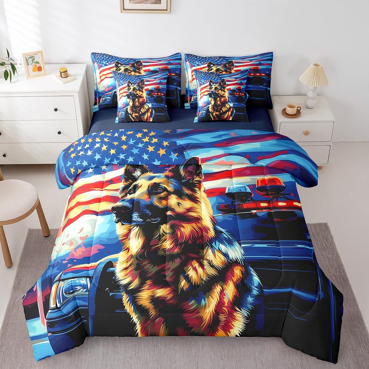 7 Pieces Twin Size German Shepherd Dog Comforter Set,Tie-dye Graffiti American Flag Bedding Set for Boys Men,Police Car Animal Pet (Comforter+Fitted+