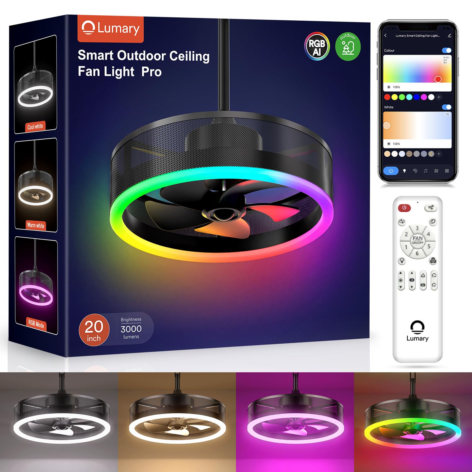 Lumary 20'' Smart Outdoor Ceiling Fans with Lights Pro, Wi-Fi Bluetooth Direct Connect RGBCW Gazebo Fans, 40+ Scenes Mode, Compatible with Alexa &