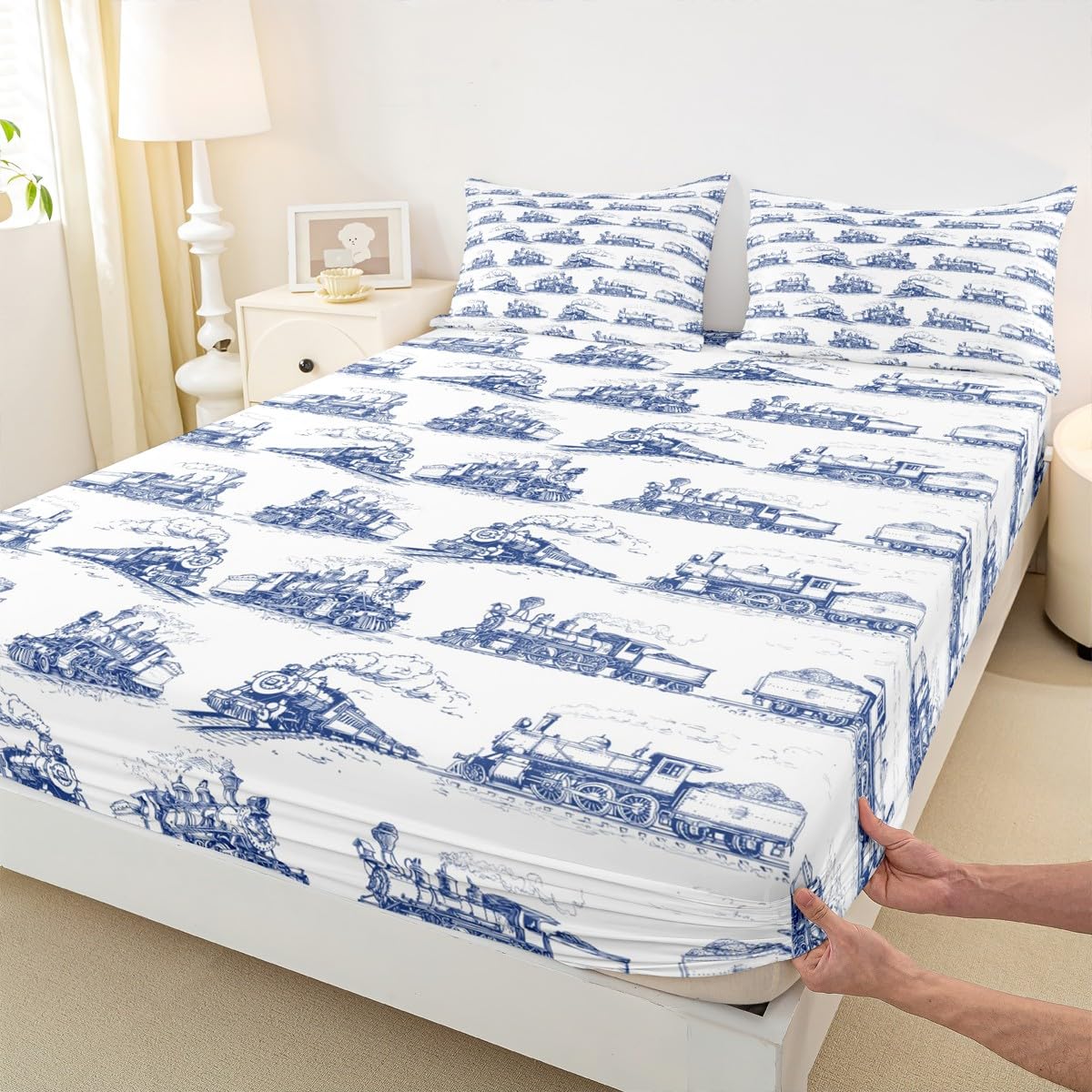 Vintage Train Fitted Sheet Full Size,Construction Transportation Vehicles Bedding Set for Kids Boys Teens Room Decor,Sketch Navy White Bed Sheet Soft