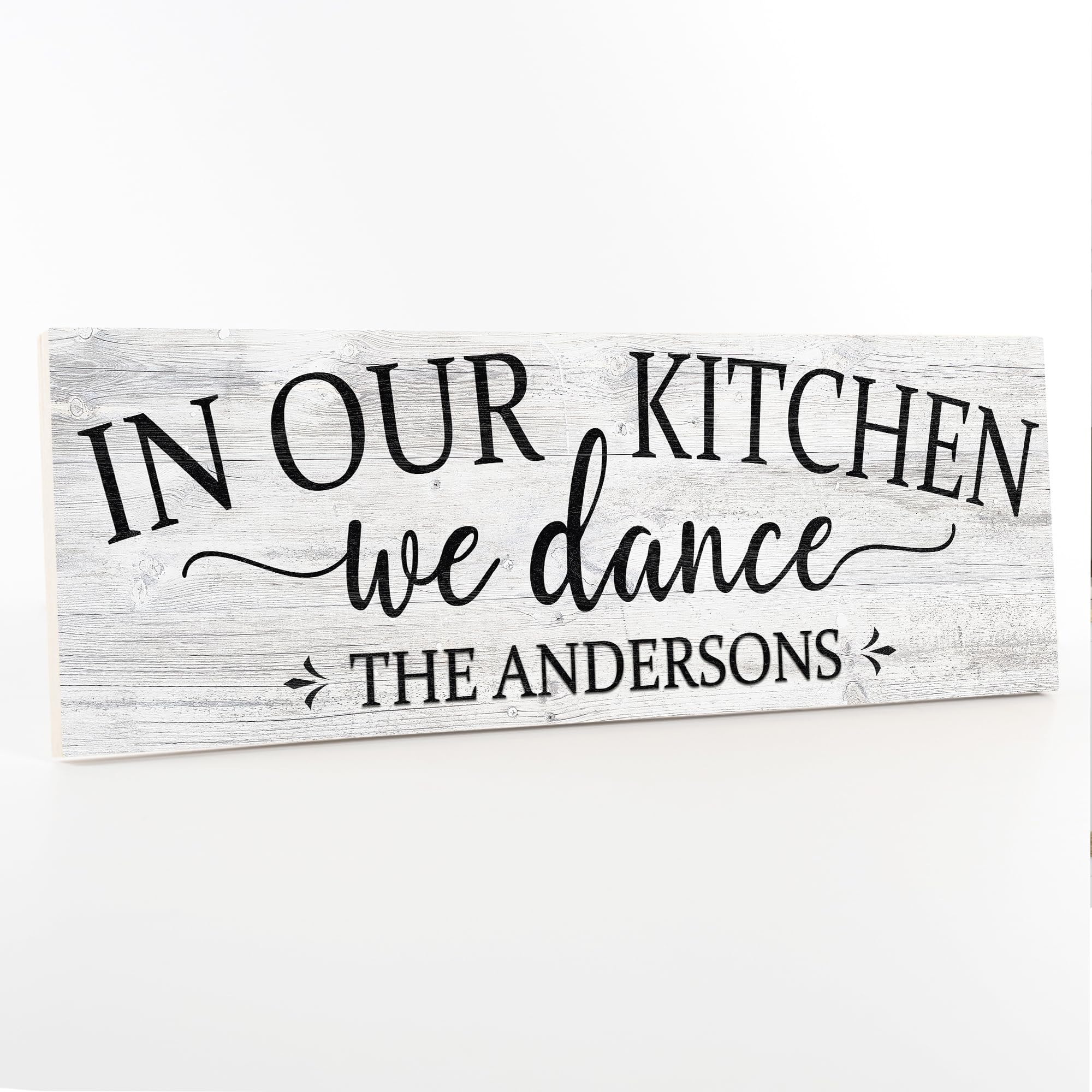 In this Kitchen, We Dance Personalized Farmhouse Rustic Looking Home Decor Wood Sign Gift (6" x 18" - Personalized)