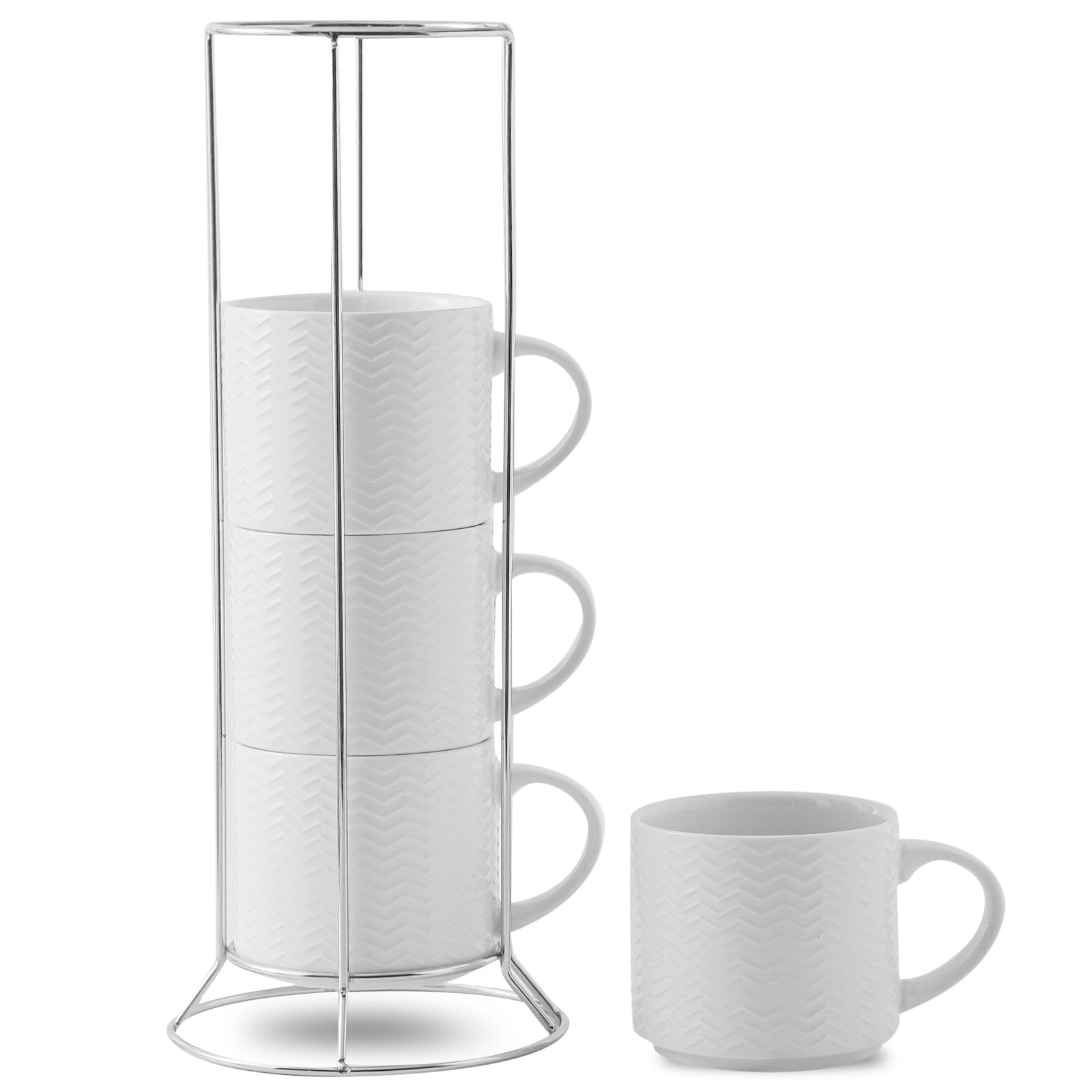 HASENSE Coffee Mugs 12 OZ Ceramic Cups Set of 4, Stackable Embossed Coffee Cups with Rack, Porcelain Coffee Cups for Latte, Cappuccino, Mocha, Cocoa,