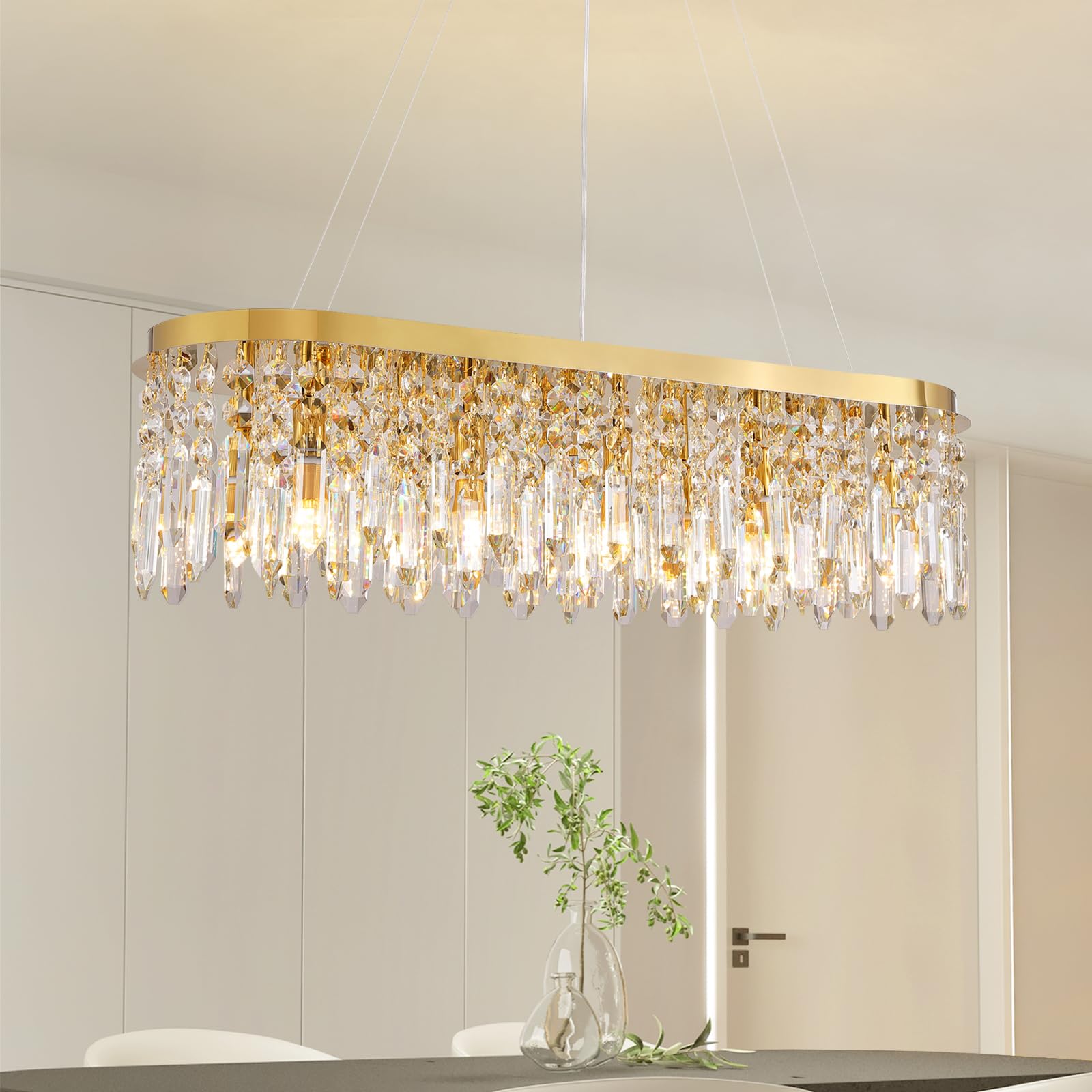 Siljoy Rectangular Gold Crystal Chandelier for Dining Room, 10-Light Modern Oval K9 Crystal Raindrop Chandelier Luxury Crystal Island Light for Living