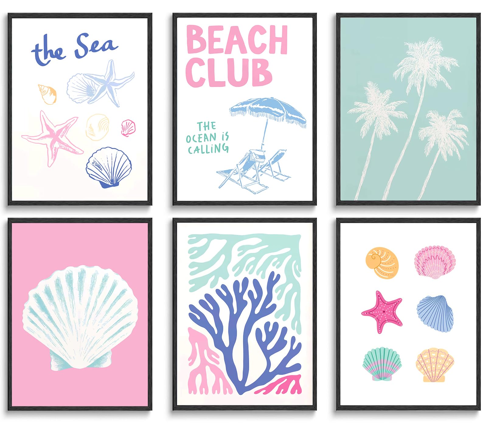 6Pcs Coastal Wall Art Pink Summer Beach Girl Wall Decor Pictures the Sea Beach Club Shell Plant Starfish Posters Canvas Print for Shoreside Themed