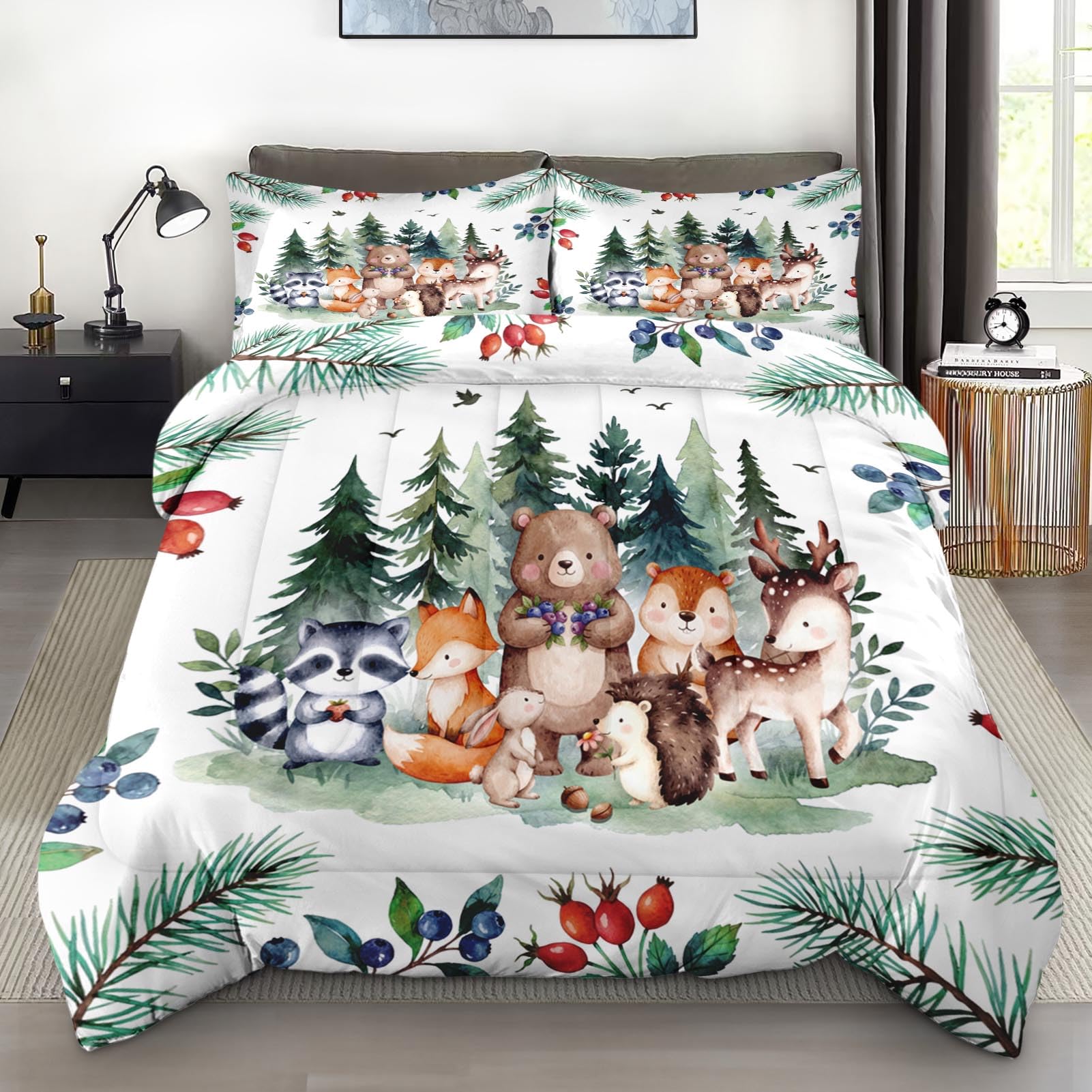 Pamnest Comforter Set Queen Size, Safari Woodland Animal Bird Soft 3 Pcs Bedding for Kids and Adults, Fox Cute Bear Jungle Comforter Set with