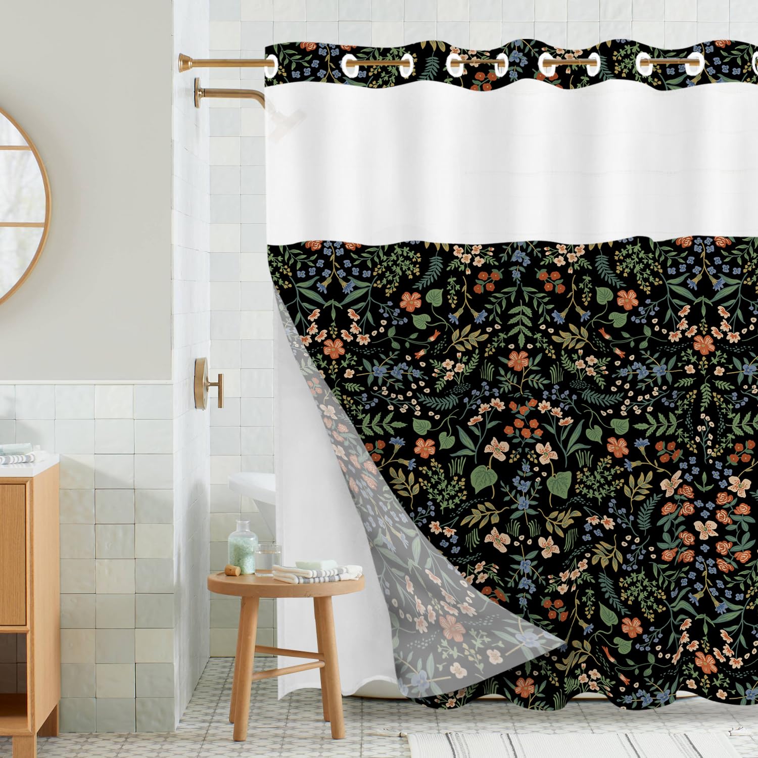 Tititex No Hooks Snap in Liner Rustic Red Floral Leaves Black Shower Curtain, Hotel Luxury Double Layers Waterproof Fabric & See-Through Top Window
