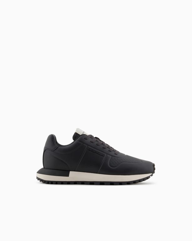 Men's Emporio Armani Leather Sneakers With Thermoformed Details - Black - Low-top sneakers Sneakers made from recycled leather with side logo that adds distinction, and embossed thermoformed details. The customised running shoe sole is made of...