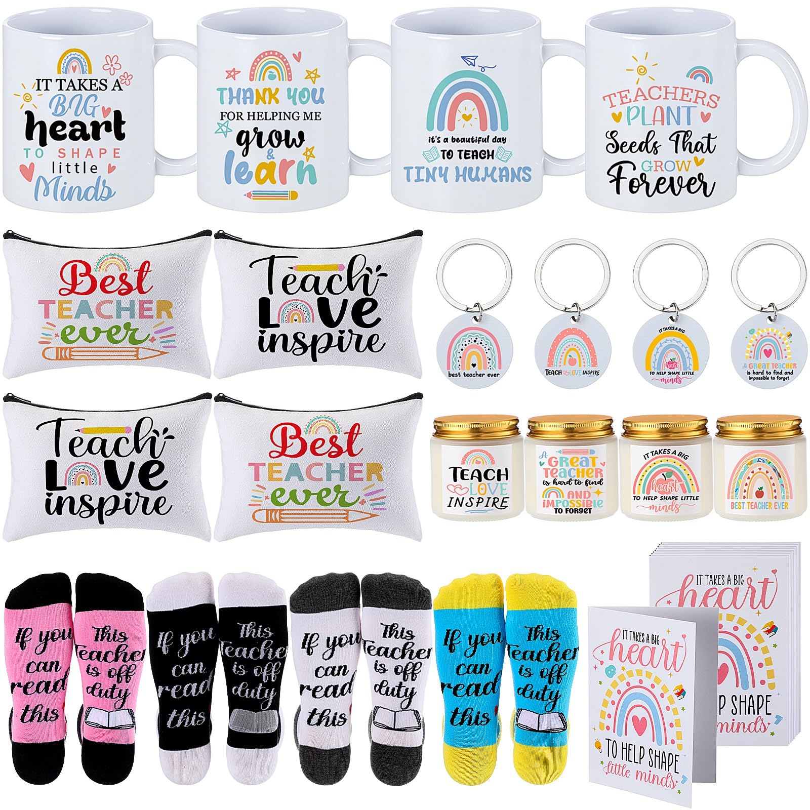 Teacher Appreciation Gifts Set: surprise your favorite teacher with this rainbow theme thank you gifts set; The package includes 4 scented candles, 4 coffee mugs, 4 cosmetic bags, 4 pairs of socks, 4 keychains, and 4 greeting cards, exquisitely presented and designed to express your gratitude to the