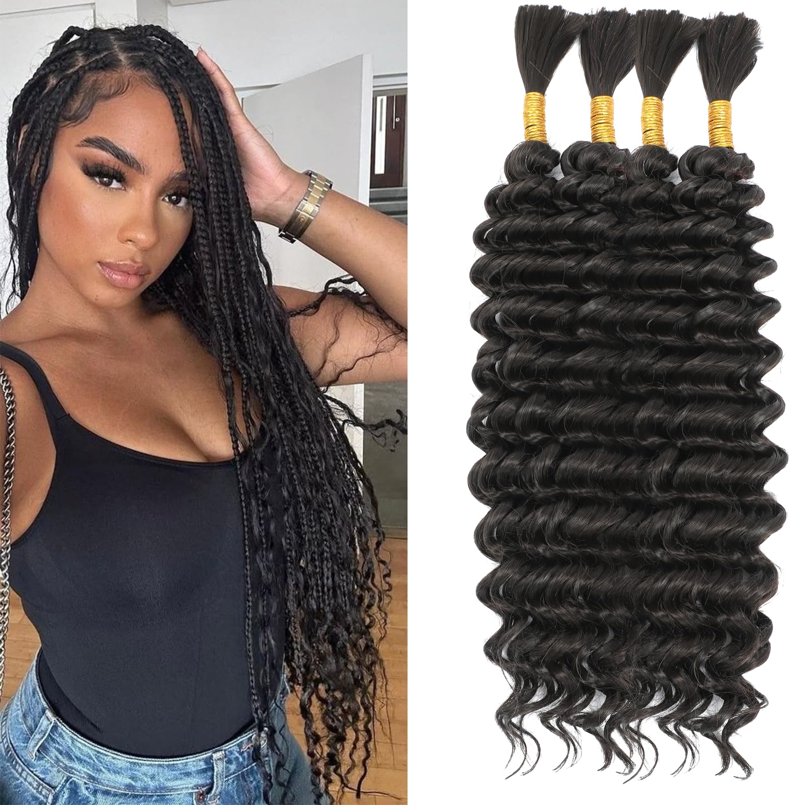 Human Braiding Hair Mix Synthetic Boho Hair for Braiding, 20 Inch 240g Boho Braids 4 Bundles Wet and Wavy Curly Deep Wave Bulk Bohemian Extensions for