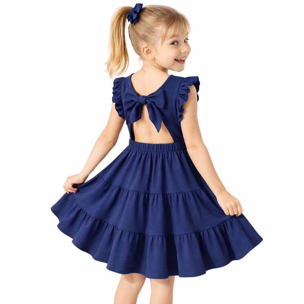 HILEELANG Girls Twirl Dress Open Back Bow Tie Cotton Tiered Ruffle Sleeve Summer Dress for Little Girls 2-8 Years