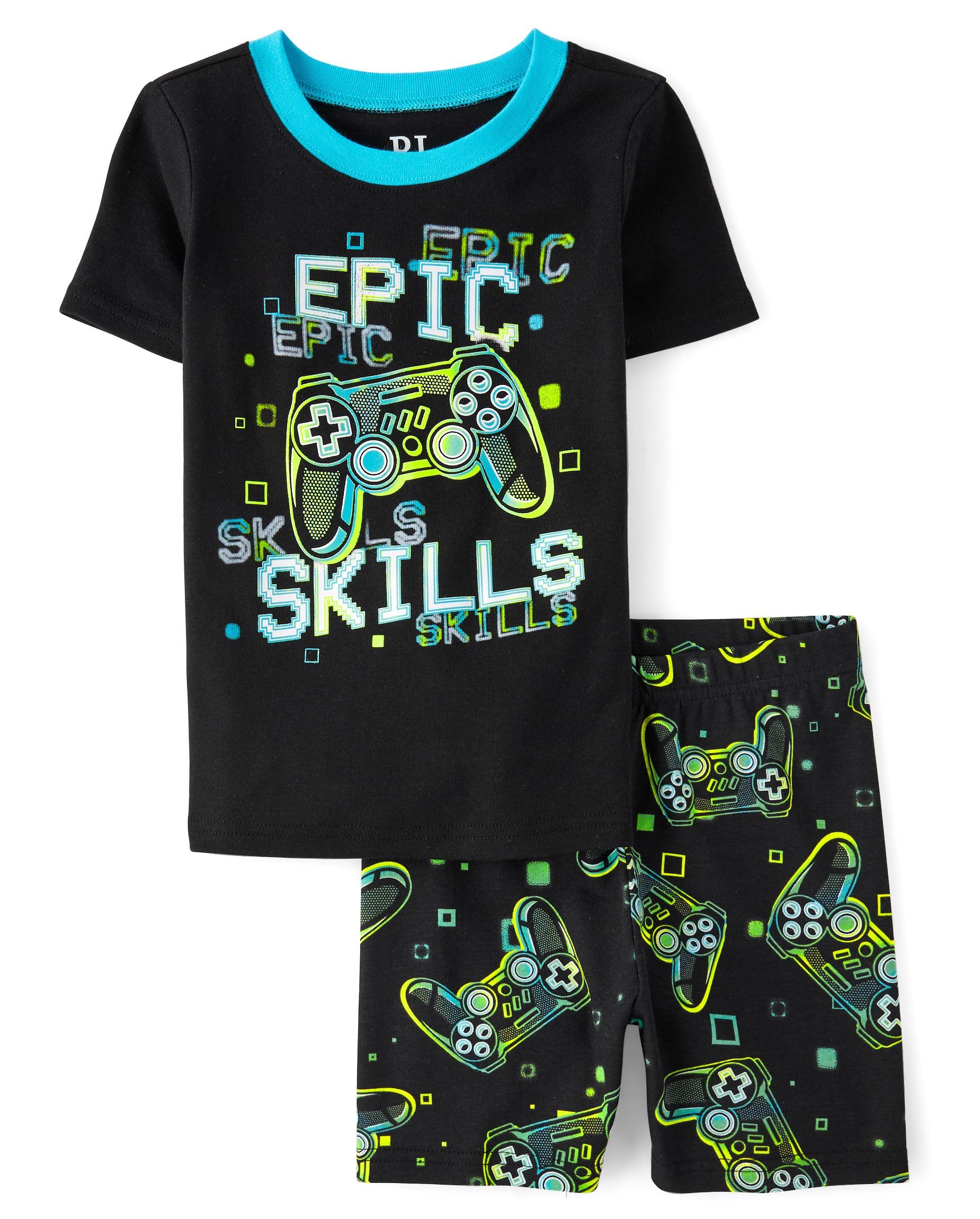 FABRICATION: 100% rib-knit cotton, imported PAJAMA TOP: Contrast crew neck, short sleeves, 'Epic Skills' with video game controller graphic design PAJAMA SHORTS: Pull-on elasticized waistband, video game controller print Note: For child's safety, garment should fit snugly. This garment is not flame