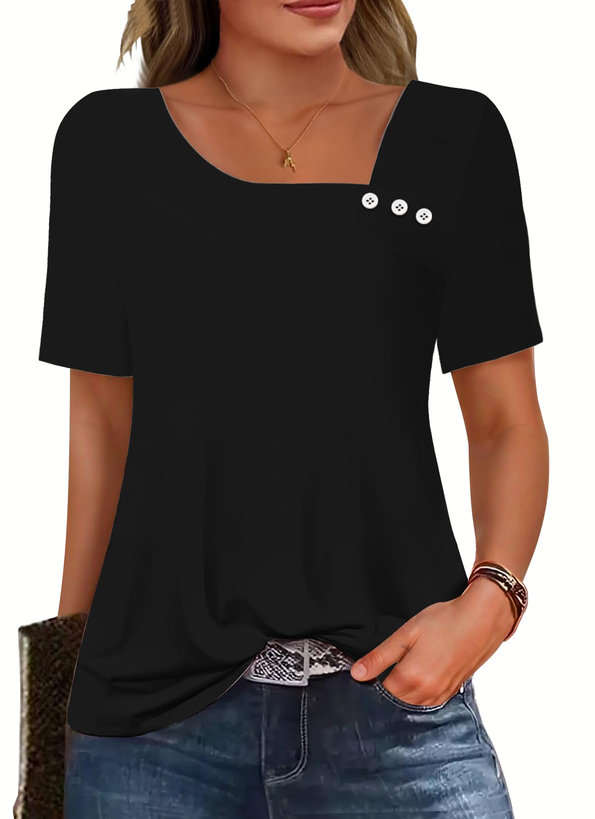 Soesdemo Short Sleeve Shirts for Women Asymmetrical Square Neck with Button Tops Casual Flowy Lightweight Summer Blouses