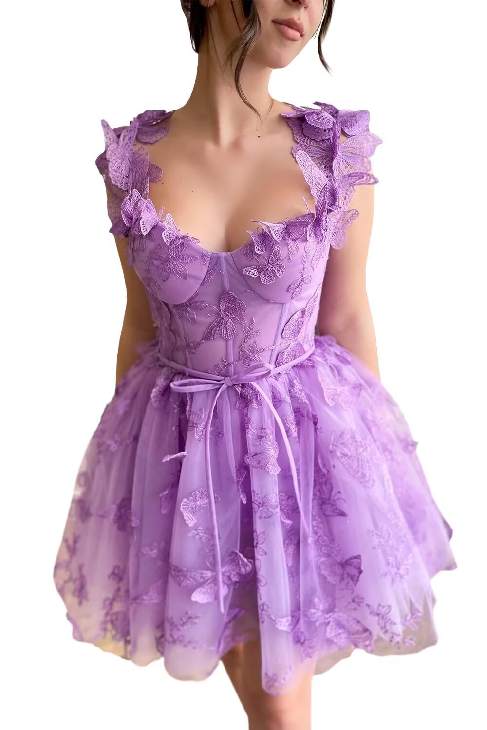 Features:This short lace applique tulle homecoming dress features 3D butterfly as the biggest highlight. Puffy A Line silhouette makes you like a princess. Sweetheart neck, soft lace applique tulle,spaghetti straps, above knee length,side pockets, lace up back,built in bra. Whether it's for a homeco