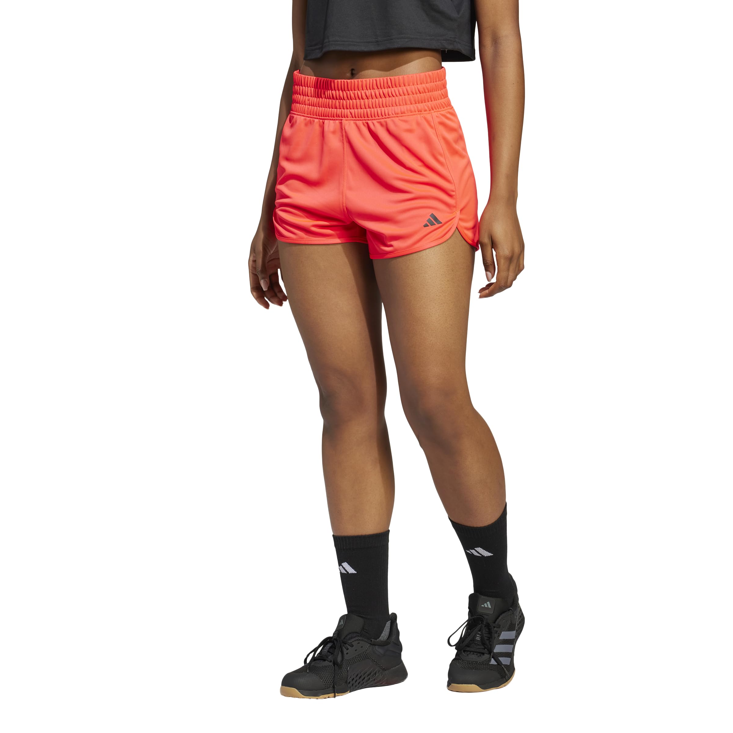 Women's high-rise shorts with a shaped hem for a stay-put feel and a comfortable workout REGULAR FIT: Strikes a comfortable balance between loose and snug FEEL DRY, STAY DRY: adidas AEROREADY manages your body's moisture to keep you dry and in the zone ELASTIC WAIST: The comfortable stretch lets you