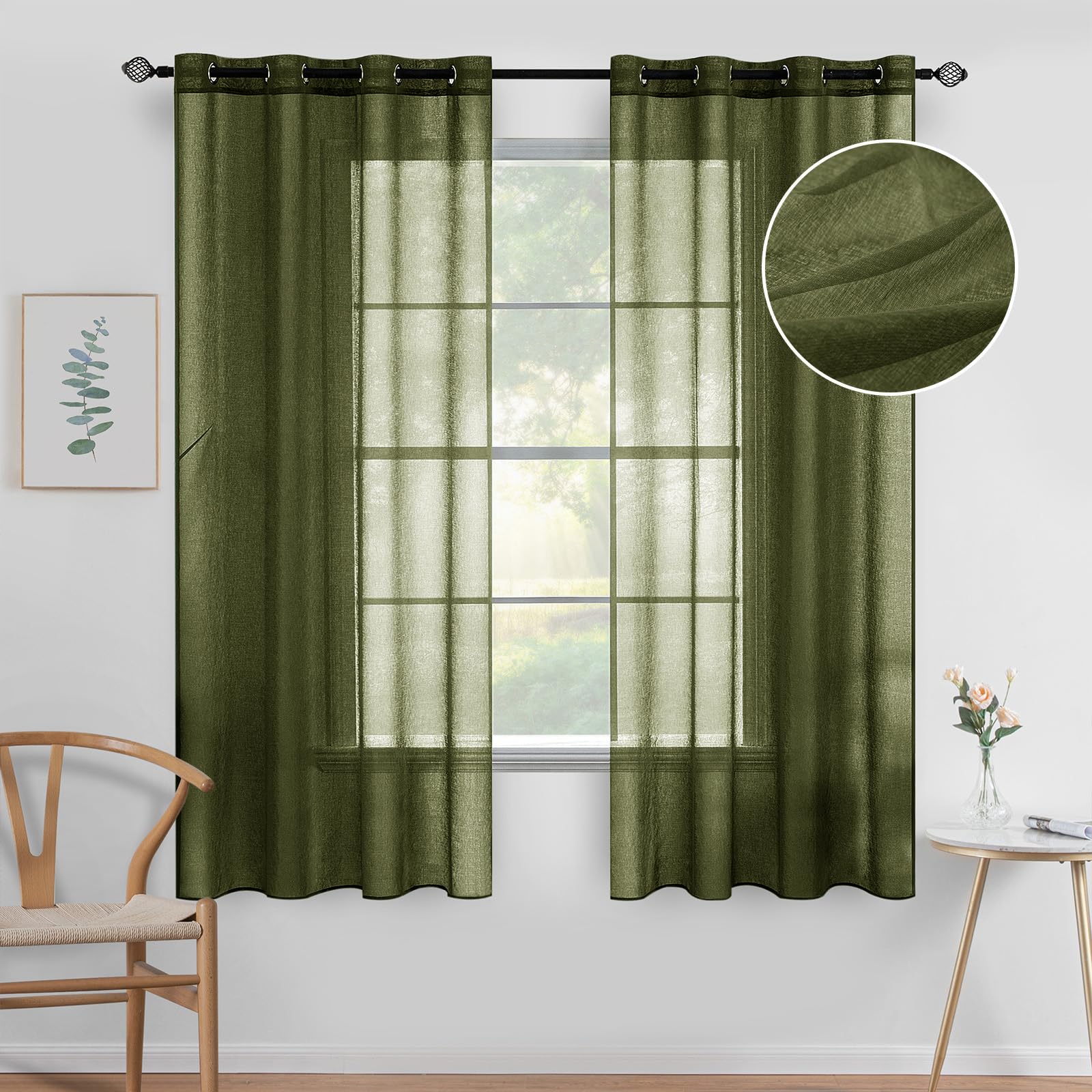 MIULEE 2 Panels Olive Green Semi Sheer Window Curtains Elegant Grommet Top Window Voile Drapes/Treatment Linen Textured Dark Green Panels for Bedroom