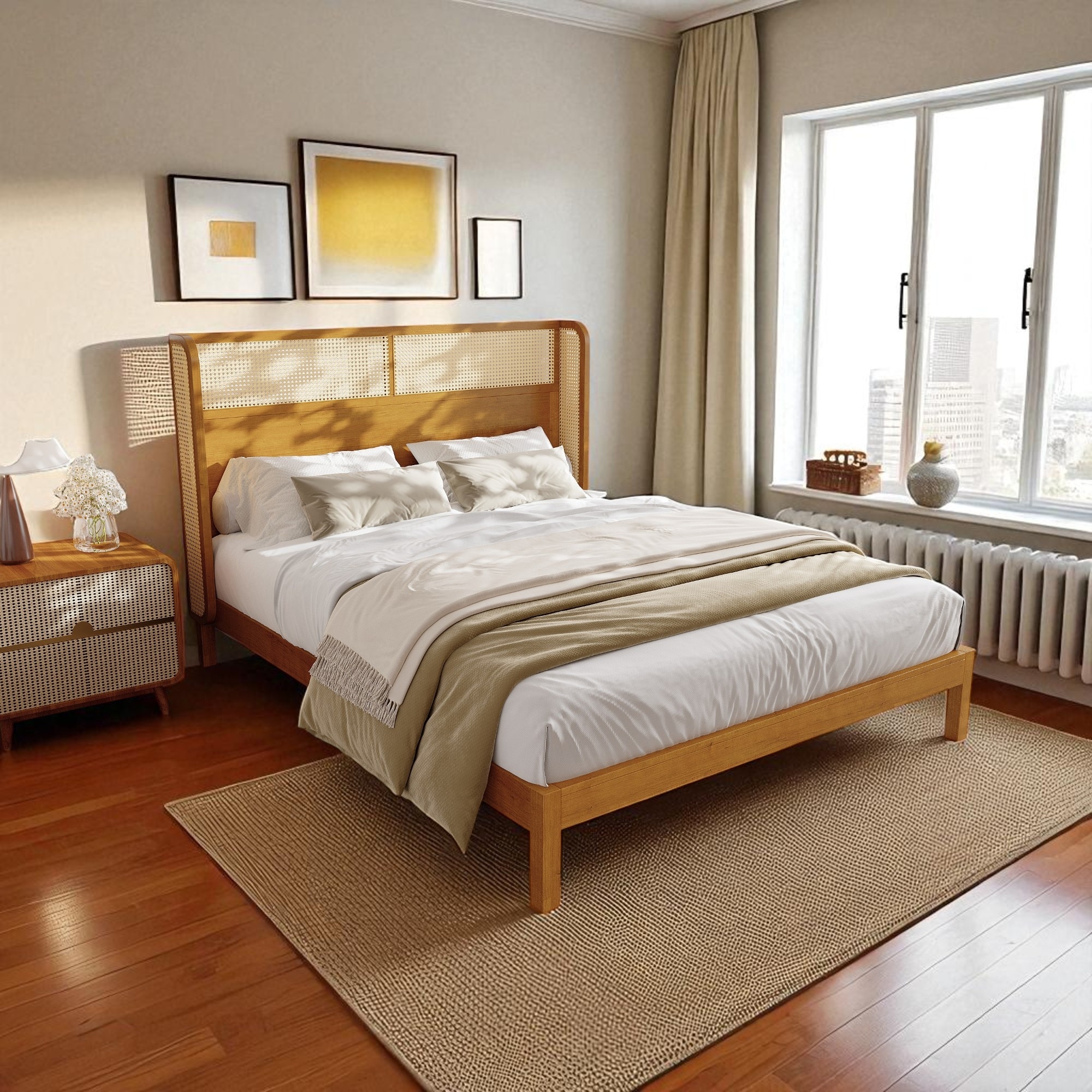 Product Introduction Experience the perfect balance of form and function with this premium Queen/King size platform bed. Crafted from solid rubber wood with a warm natural finish, this bed brings timeless mid-century modern charm to your bedroom.