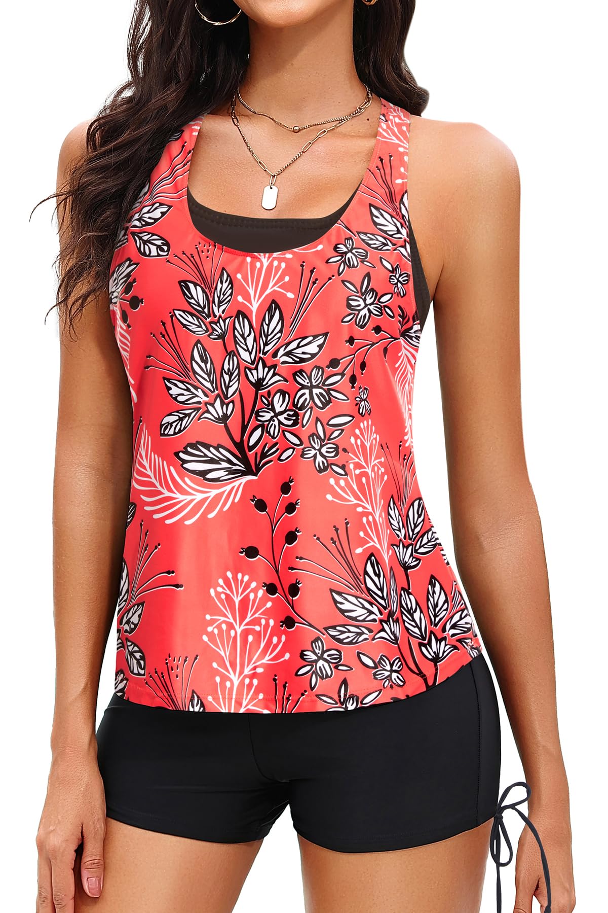 Tankini with Shorts: This 3-piece tankini bathing suit offers you two combinations: as a bikini with shorts or as a 3-piece tankini set. Supportive Tankini Top: This red floral bathing suit tank top conceals your tummy, while the push-up padded bra provides ample support. Full Coverage Boyshort: Our