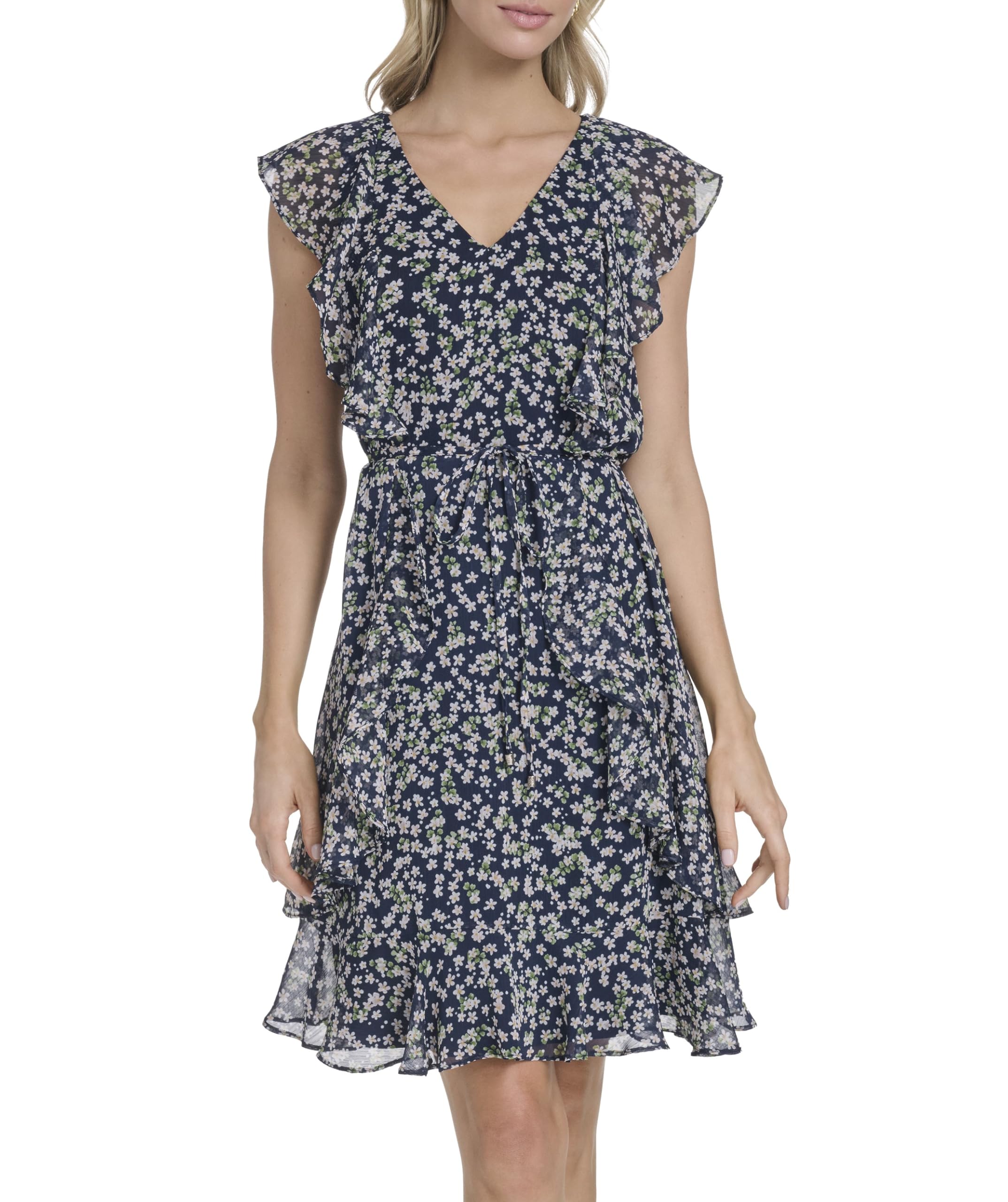 Tommy Hilfiger Women's Sleeveless V-Neck Ruffle Trim Tie Waist Chiffon Mini Dress