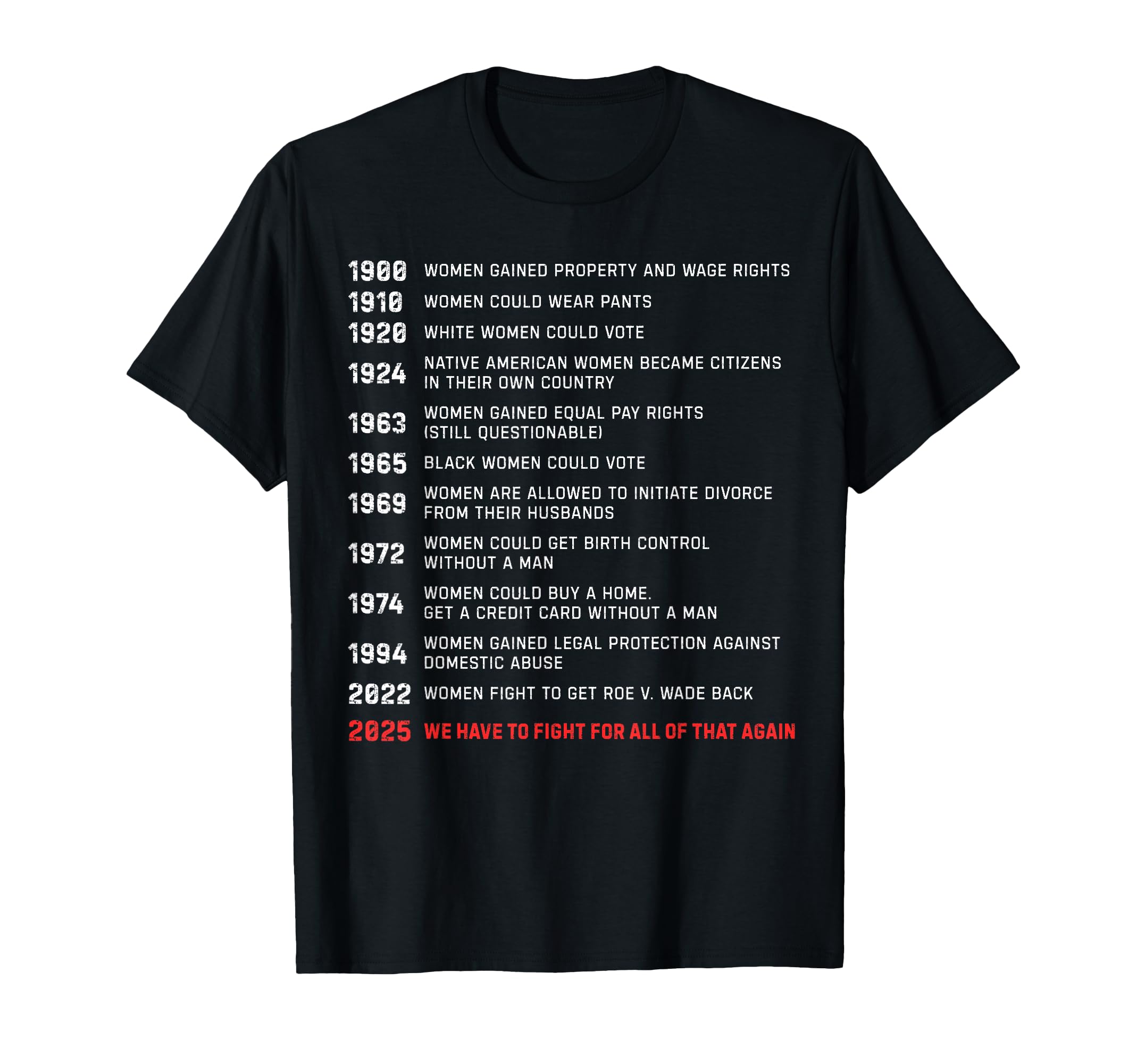 Women's Rights Feminism design. 1900 Women gained property and wage rights 1910 Women could wear pants 1920 White women could vote 1924 Native American women became citizens in their own country 2025 We have to fight for all of that again. Feminist, activists top with the phrase: 1900 Women gained p