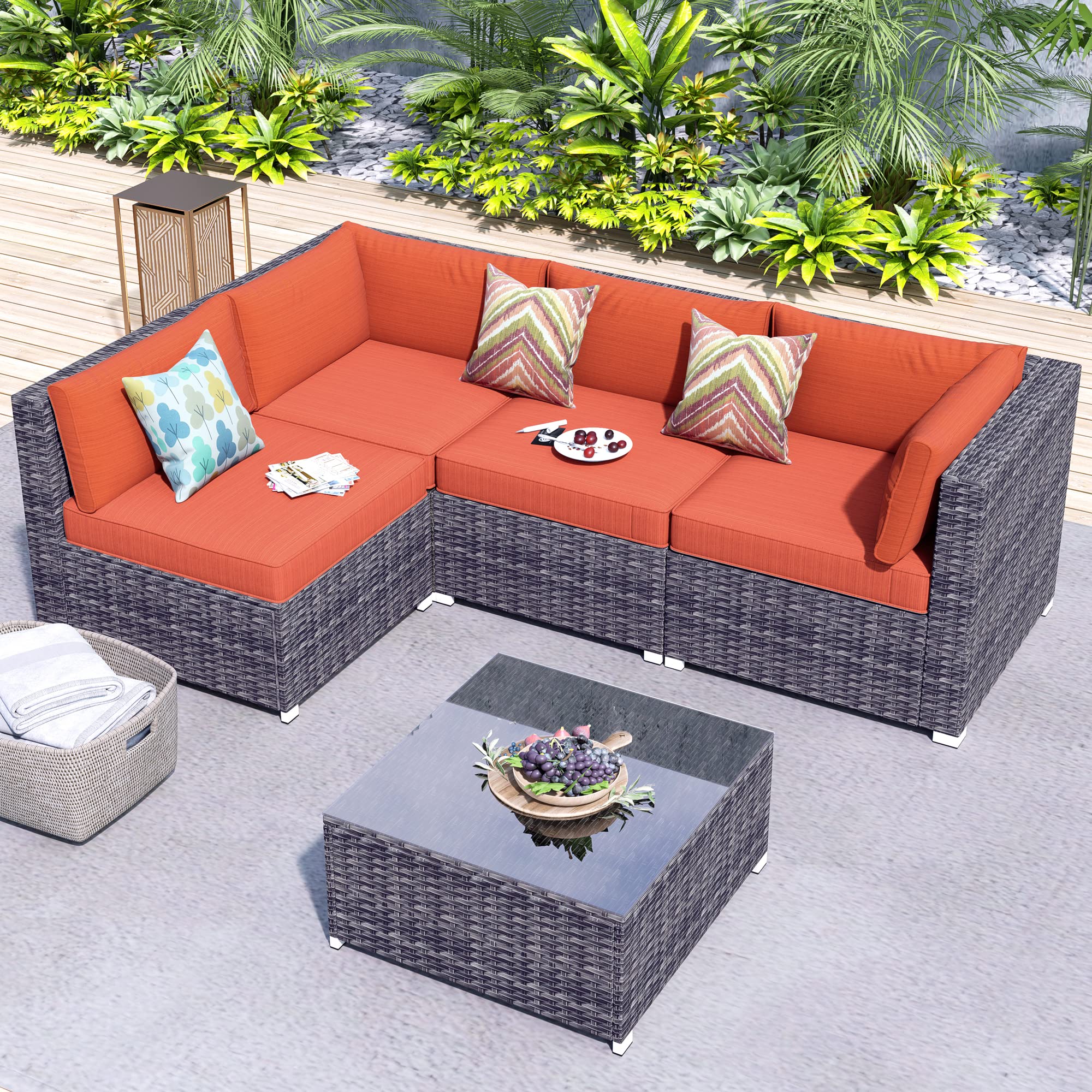 HOOOWOOO Patio Outdoor Furniture Sectional Couch Set,5 Piece Wicker Weather Resistant Conversation Set,Modern Corner Modular L Shaped Sofa Set with
