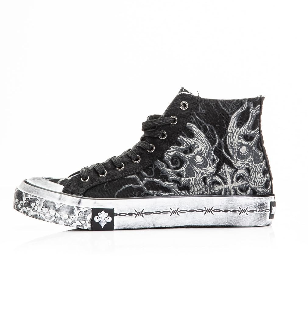 BOLD GRAPHIC DESIGN: Features striking black canvas upper with detailed silver skull artwork for an edgy, alternative style statement HIGH-TOP CONSTRUCTION: Classic lace-up hi-top silhouette with 7 eyelets provides ankle support and a timeless streetwear look DISTRESSED SOLE DETAILS: Unique weathere