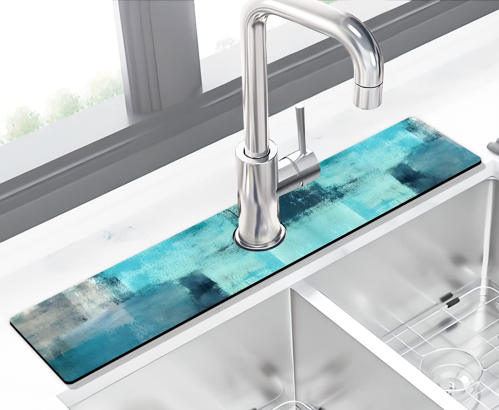 SUPER ABSORBENT:Soaks up splash instantly like a giant sponge, prevent water pooling. Rubber backing prevent water flowing underneath and mess up your countertop. FAST DRYING: Air dry completely within one hour, and you don’t need to clean it frequently. ONLY cost you few minutes to wash with dish
