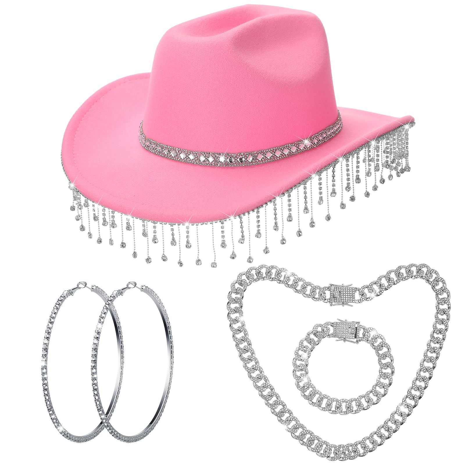 Nice Combination: you will receive 1 piece of glitter rhinestone cowboy hat, 1 piece of link chain necklace, 1 piece of link bracelet, and 1 pair of rhinestone earrings; This good combination gives you a nice decorative effect and brings a good mood, helping you create different looks; Please note:
