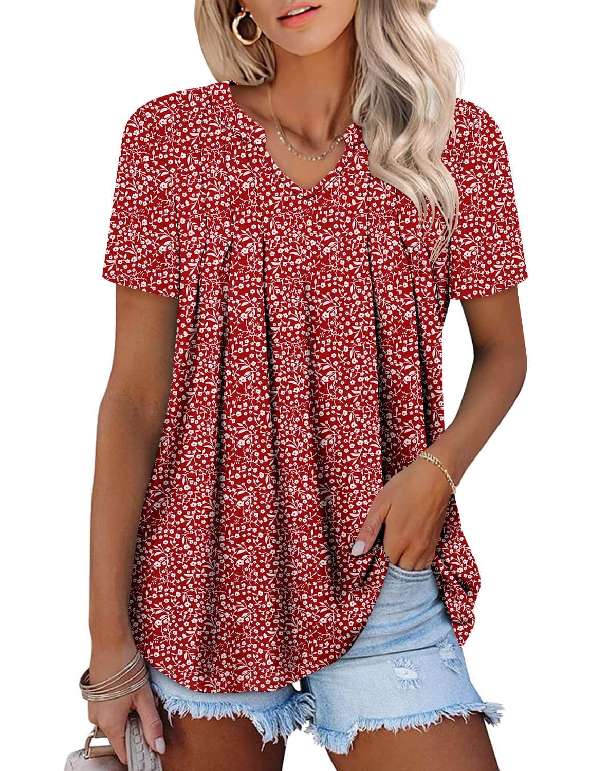 Material: 95%POLYESTER,5%SPANDEX, women's casual short sleeve shirts is made of skin-friendly,stretchy,soft and breathable; super comfy to wear,keeps you soft all day and providing you with a relaxing feeling Feature: notched v neck shirts,short sleeve blouse tops,floral printed,pleated design,chic,