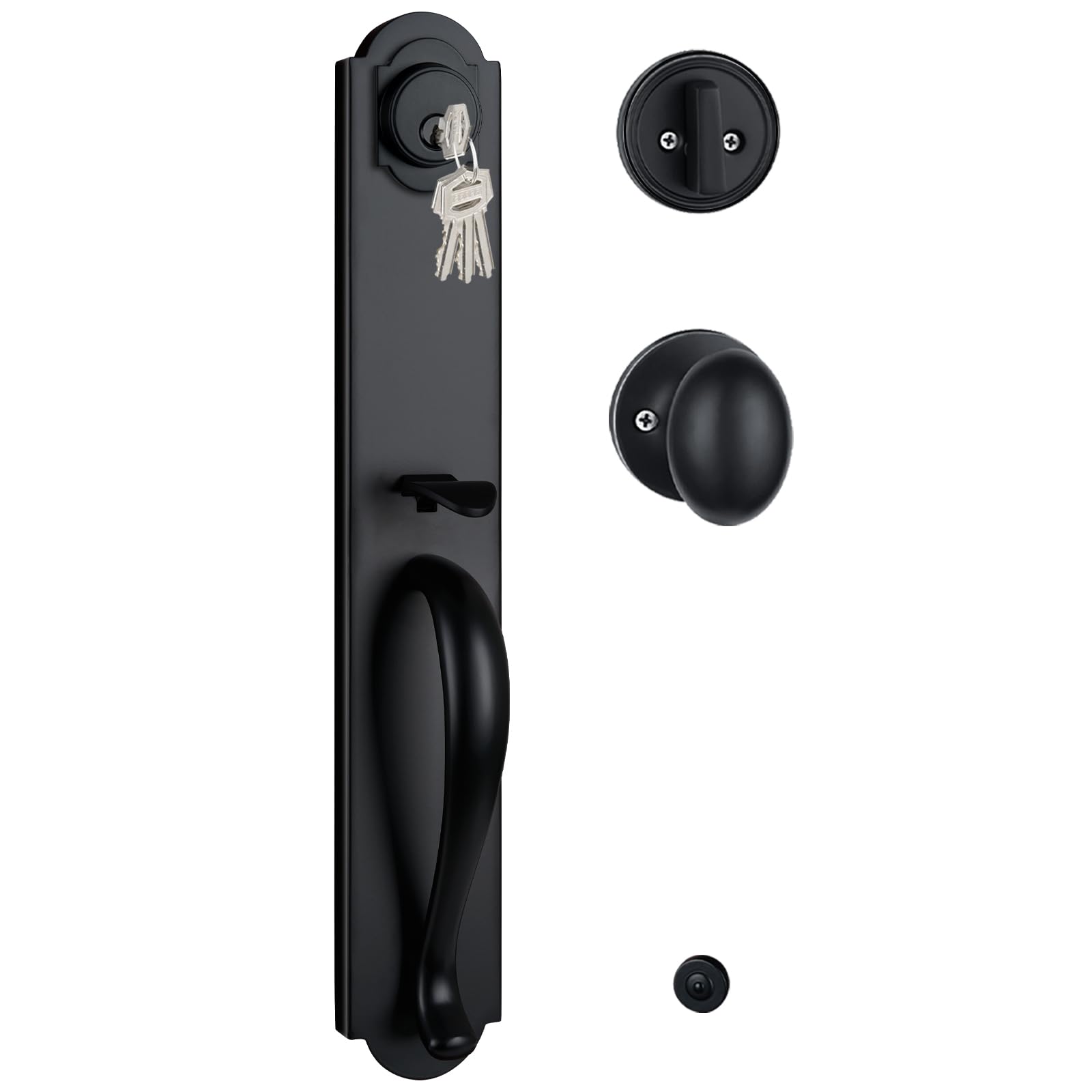【Keyed Entry Door Handle Set】This solid zinc alloy front door handle enhances the security. Including 1 Pack full escutcheon keyed entry door handle set with deadbolt&knob. 【Adjustable hole distance】You can slide handleset bottom stem to fit your door hole distance(210mm-250mm,8-1/3in to 9-5