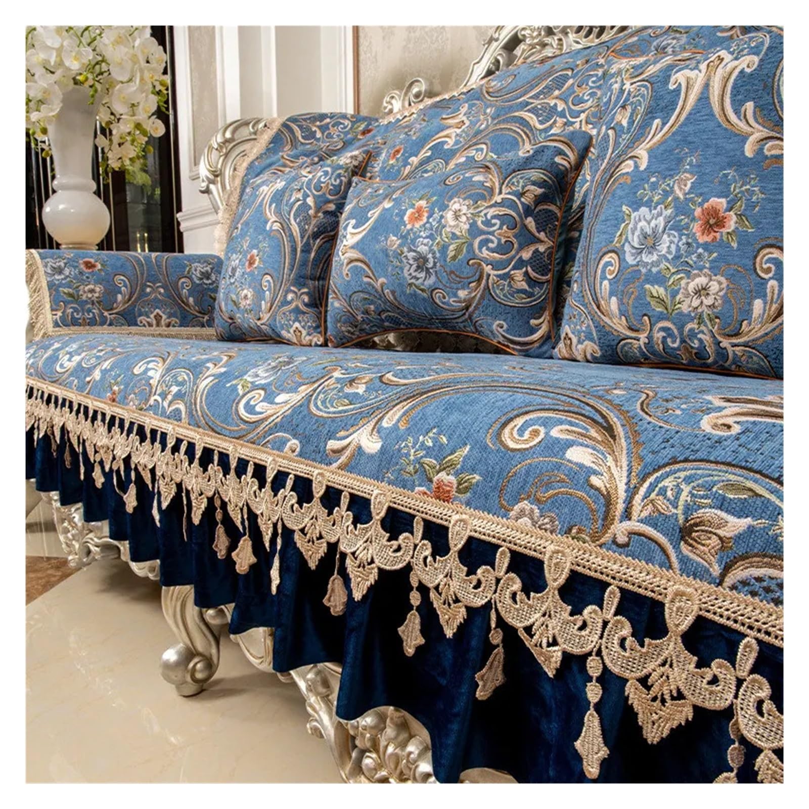DjxAzthuria Vintage Sofa Cover Retro Lace Cover for Sofa Chenille Jacquard Floral Corner Couch Slipcover Armchair Cushion 1, 2, 3 Seater(Blue-Lace,
