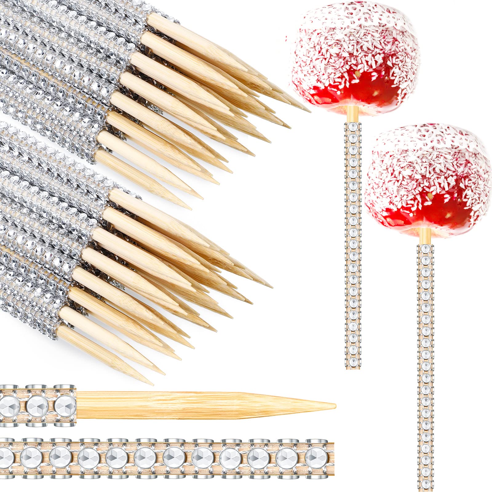 100 Pcs Bling Candy Apple Bamboo Sticks 6 Inch Rhinestone Bling Caramel Apple Wooden Skewers with Diamond Mesh Wrap for Cake Pop Fruit Candy Making